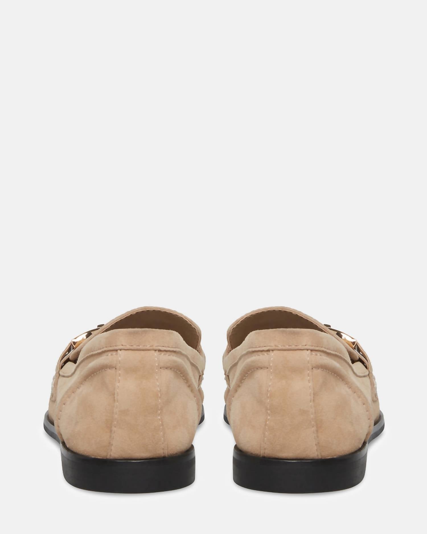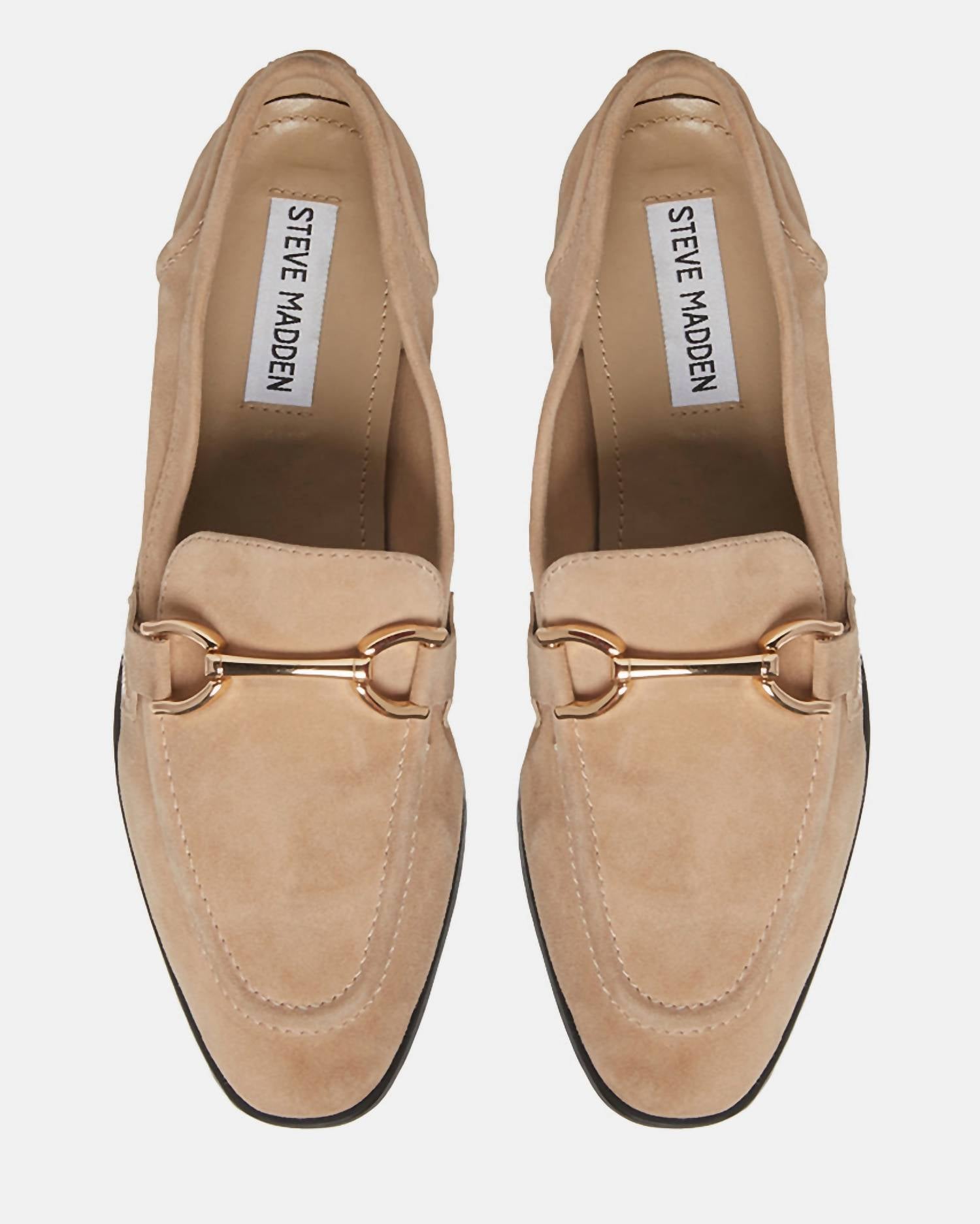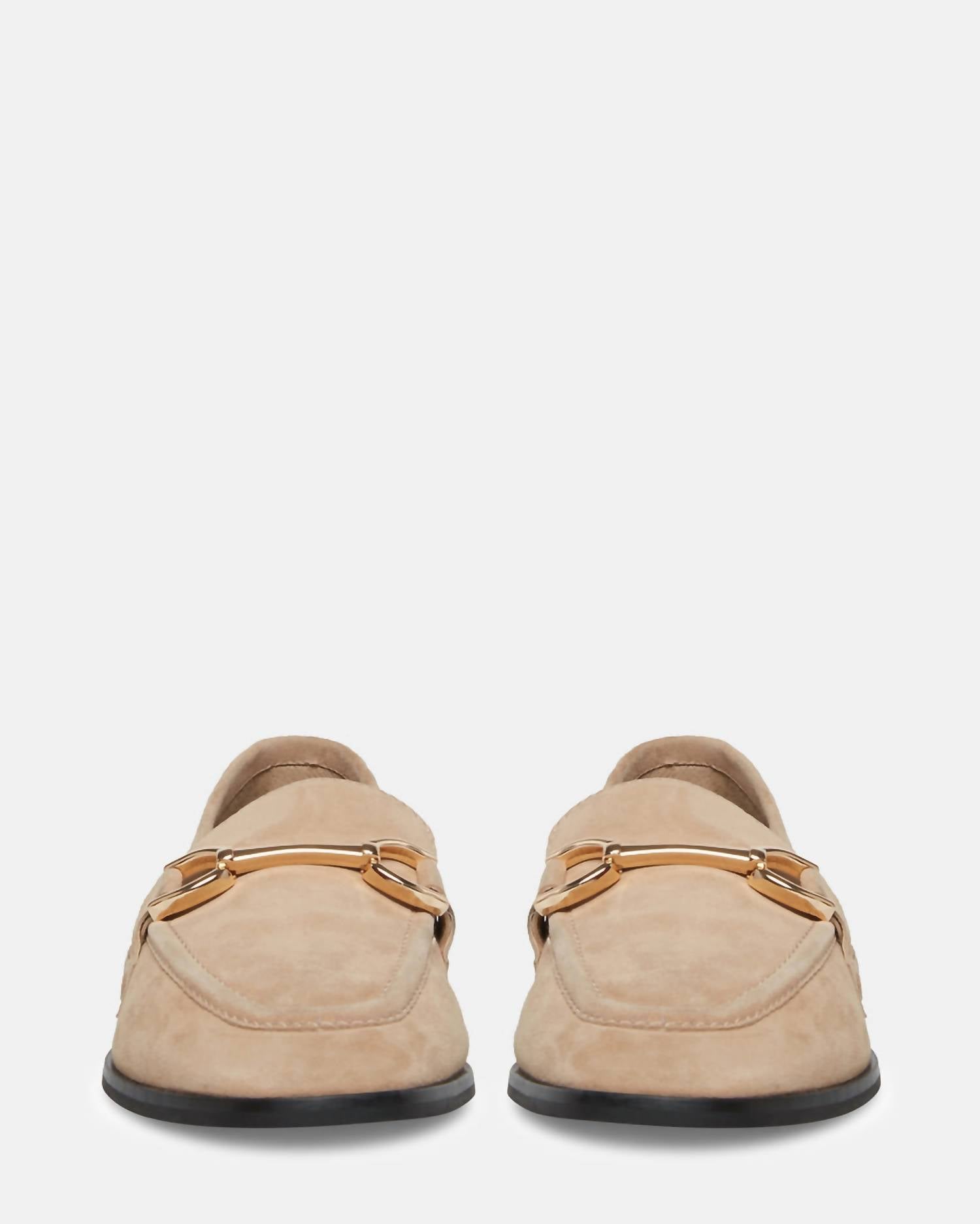 Classicly cute and all-day-wearable. We love this sandal. Introducing the Women's Carrine Suede by Steve Madden, a sleek loafer crafted for elegance in Tan Suede. This shoe features a soft suede upper, complemented by chic gold hardware, perfect for pairing with straight leg jeans and a sweater. The design includes an unlined interior, a vegan leather sock, and a synthetic sole, with a subtle 0.5-inch heel height for added comfort. Imported for quality, these loafers are the epitome of polished style with an almond toe and flat heel design.