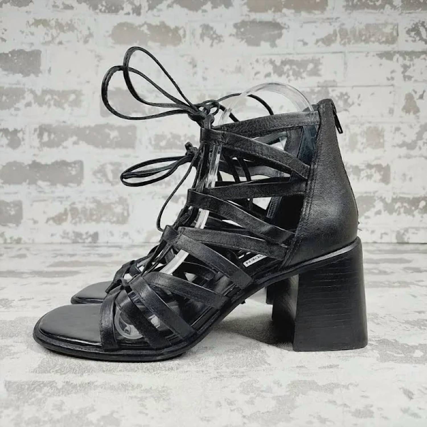 These block-heel sandals feature elegant wrapping ankle ties and intricate ghillie laces, elevating any outfit. Crafted with a leather upper, they boast a comfortable 3" block heel and a stylish squared toe. Closure is seamless with a convenient back zipper, while the manmade lining and sole ensure durability.