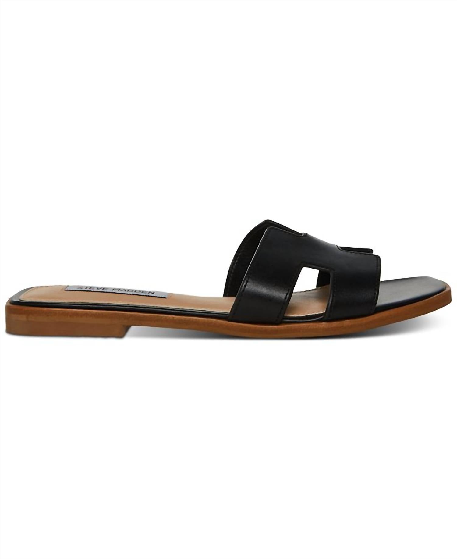 Step into effortless style with the Women's Hadyn Slide Sandal by Steve Madden. These chic sandals feature a square toe design and convenient slip-on style, accentuated with cutouts and notching details for a modern touch. Crafted with a leather upper, manmade lining, and manmade sole, they ensure comfort and durability. Heel Height: 0.25 inches. Origin: Imported.
