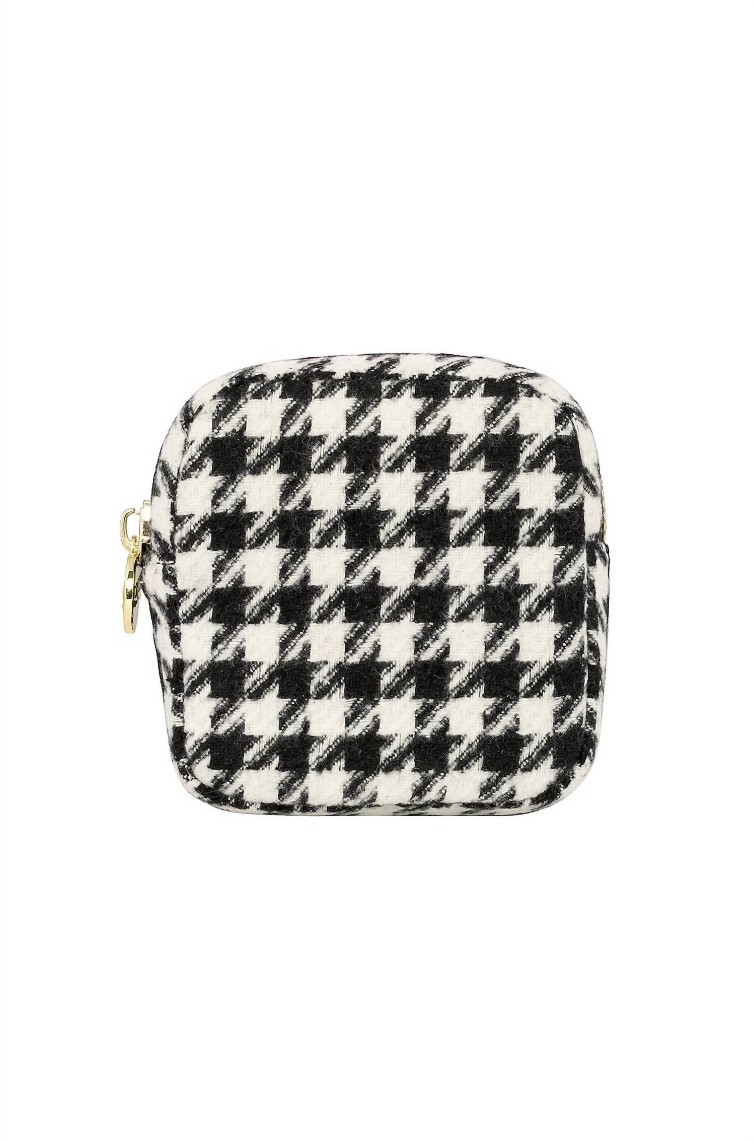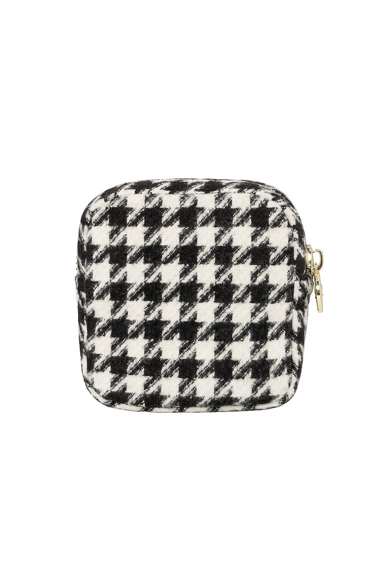 Houndstooth print design. Top zipper closure for secure storage. Easy to clean with spot cleaning. Dimensions: 5"L x 4.75"W x 2"D. Made of polyester.