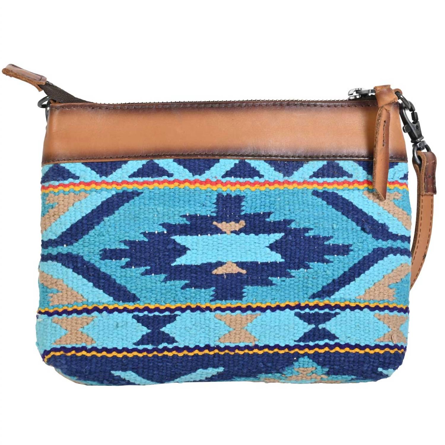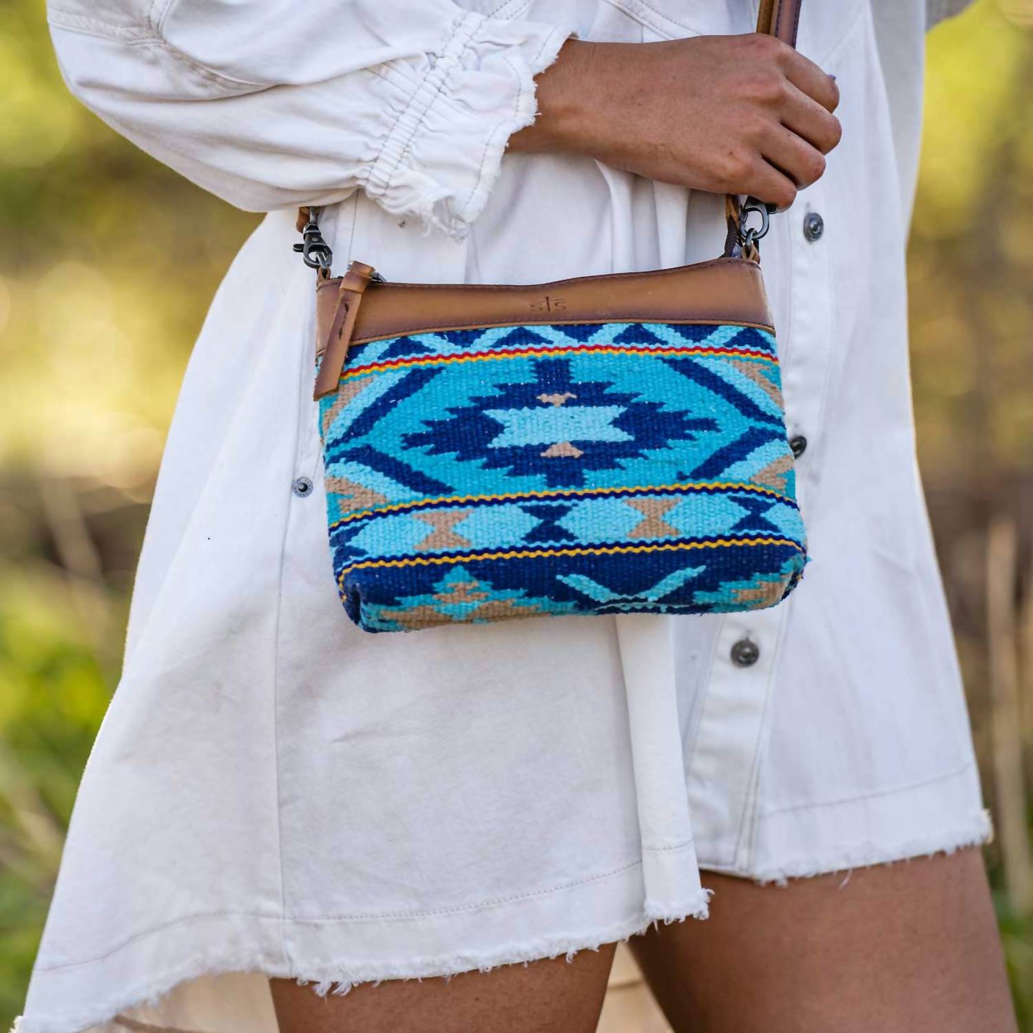 A casual and cute take on everyone's favorite crossbody bag. Stylish accessory crafted from genuine leather. Multicolor bag features a vibrant blue serape with tan and brown enzyme leather accents for a perfect blend of modern and vintage aesthetics. Offers functionality with a zip top closure and convenient interior pockets, including one zip pocket and two slip pockets. Measuring 9” W x 7” H x 2” D, with an adjustable and removable crossbody strap, it's designed for both style and practicality.
