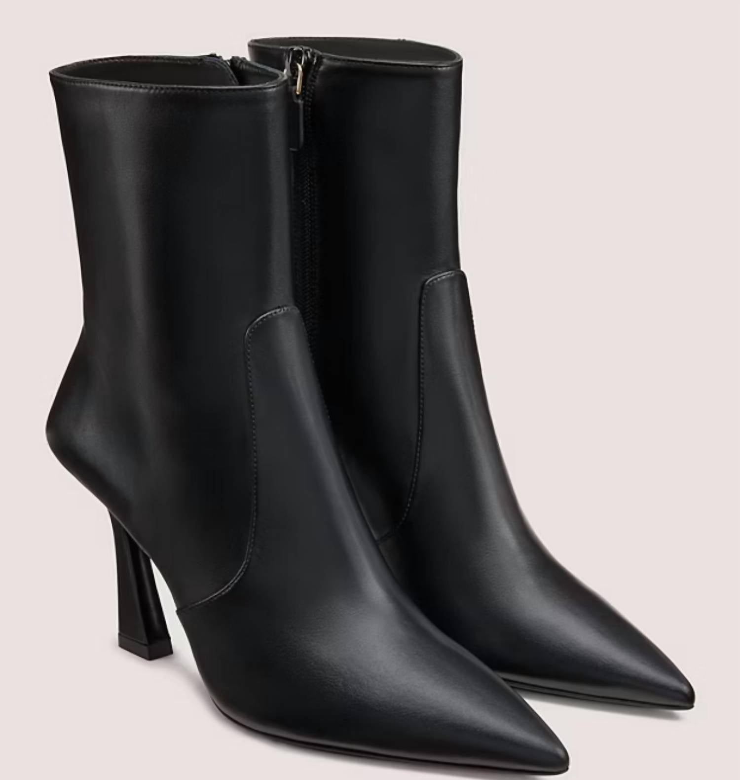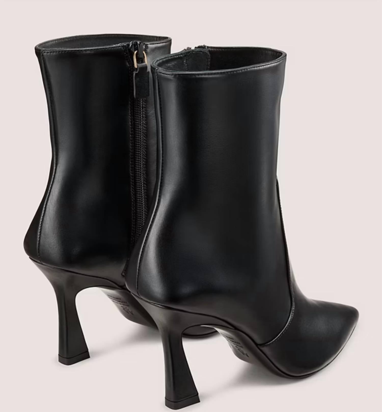 Upgrade your shoe game with these classic heeled boots, designed to merge sophistication and style. Comfortable enough for long days or a night out on the town. The Vinnie high-heel ankle boot is made of 100% black leather with a pointed toe, zip closure, and curved heel detail. It features a leather sole and an 85 mm heel. Made in Spain.