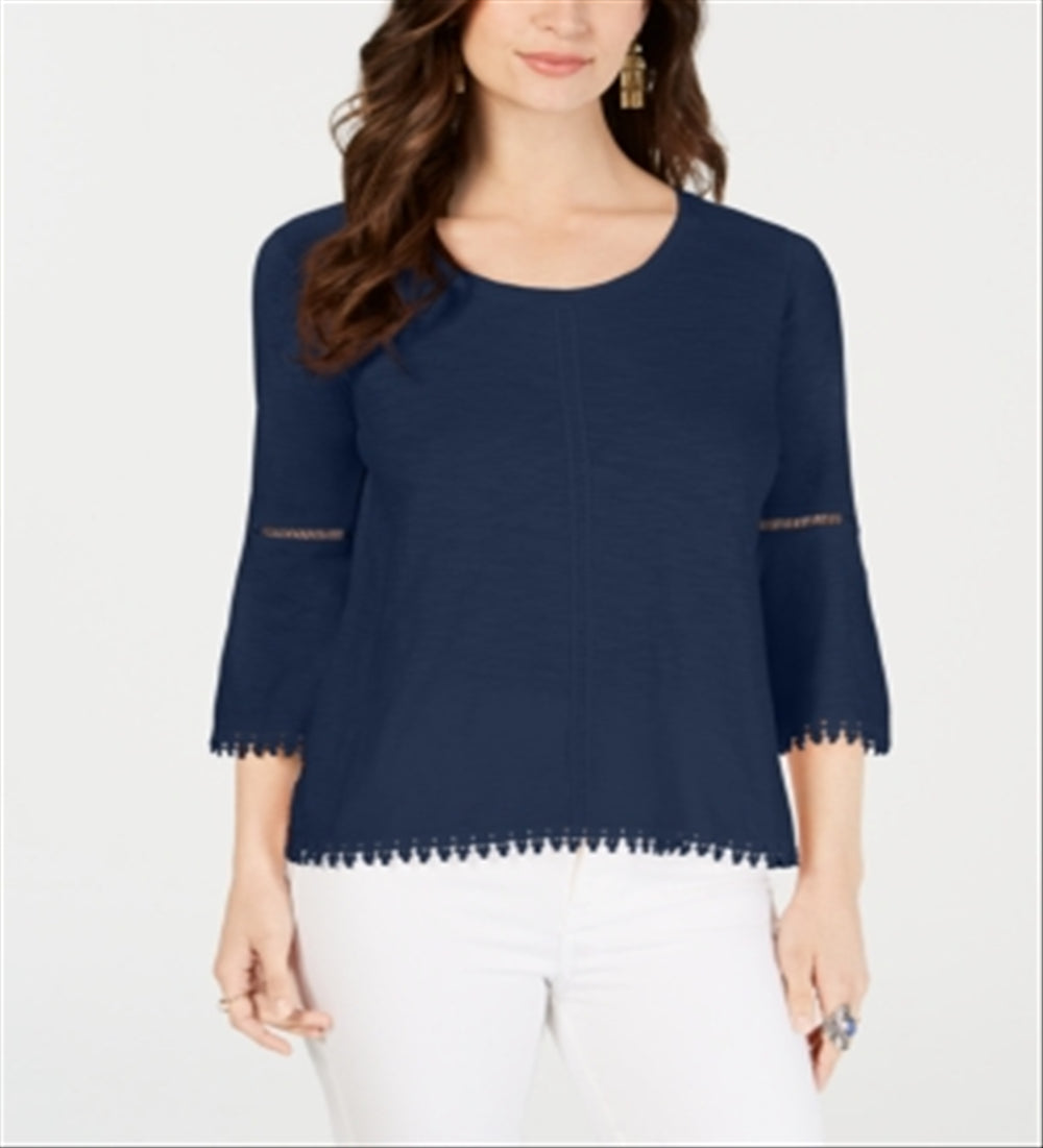 Style & Co Women's Crochet Trim Bell Sleeve Top Blue Size Medium