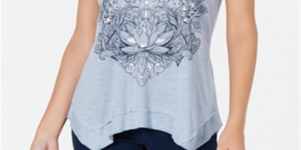 Style & Co Women's Graphic Print Handkerchief-Hem T-Shirt Blue Size Petite Small