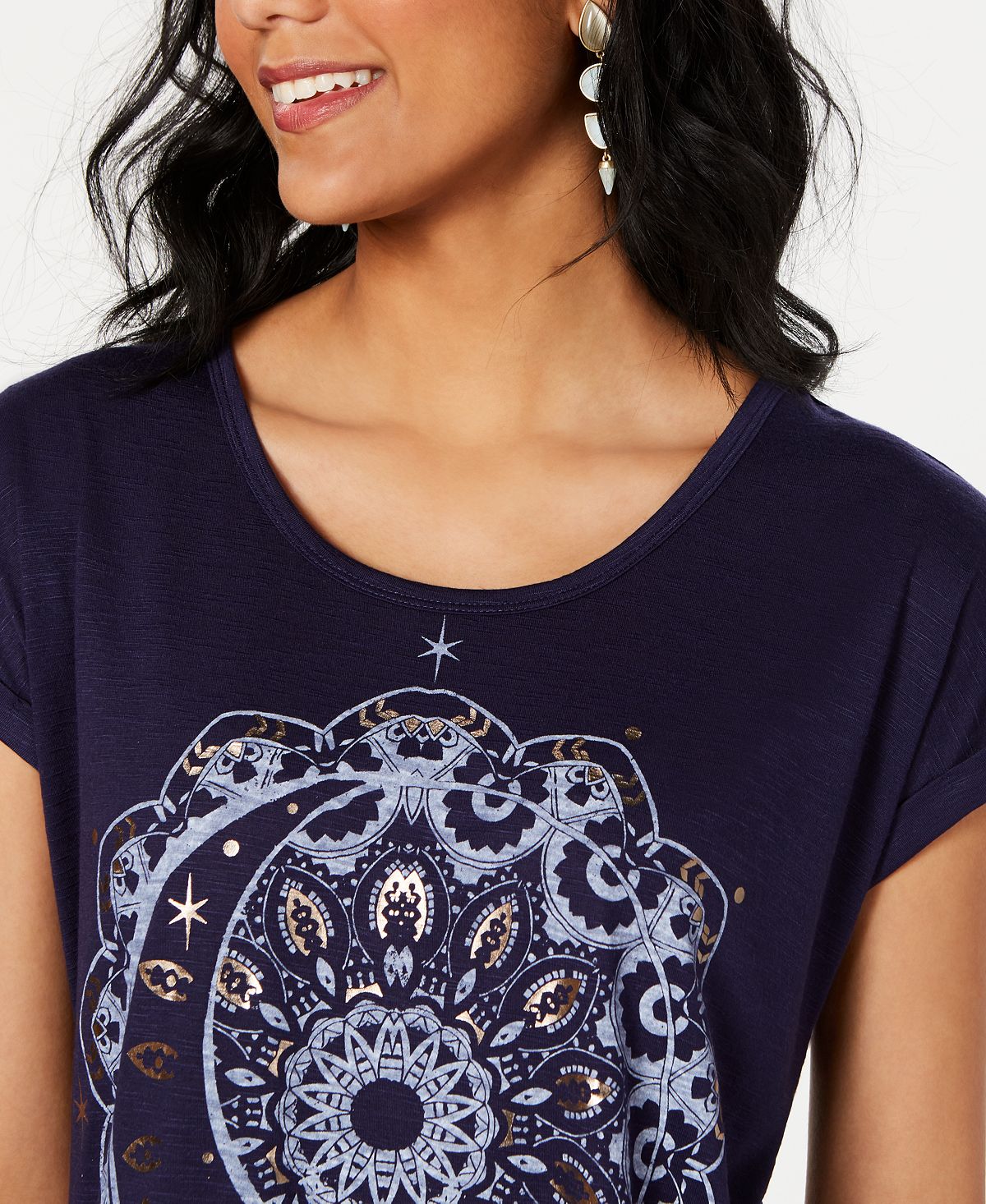 Pops of metallic turn up the shine on this petite T-shirt from Style & Co.| Relaxed fit; hits at hip; approx. 25 long| Designed to fit and flatter 5'4 and under frame| Scoop neckline| Graphic at front with metallic detail| Short dolman sleeves| Polyester/rayon