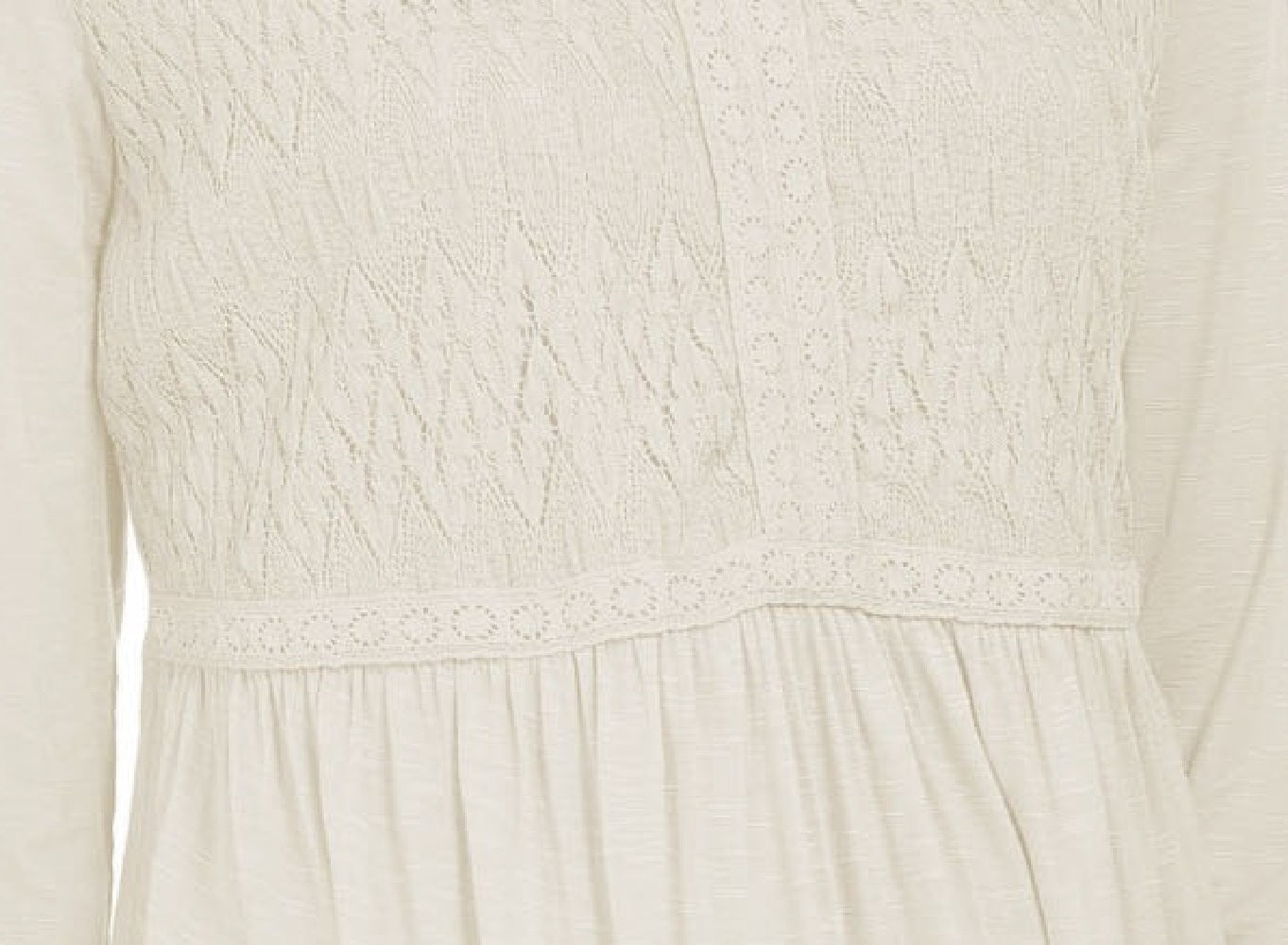 Approx. model height is 5'10" and she is wearing a size small | Relaxed fit; hits at hip; approx. 26" long | Due to generous sizing, we suggest sizing down for the perfect fit | Split V-neck | Lace-layered bodice; gathered empire-waist seam | Rayon/spandex | Machine washable | Imported