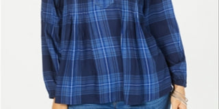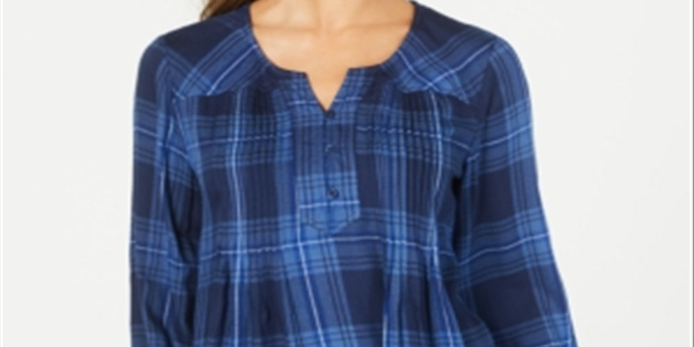 Style & Co Women's Plaid Pleated Top Blue Size Petite Large