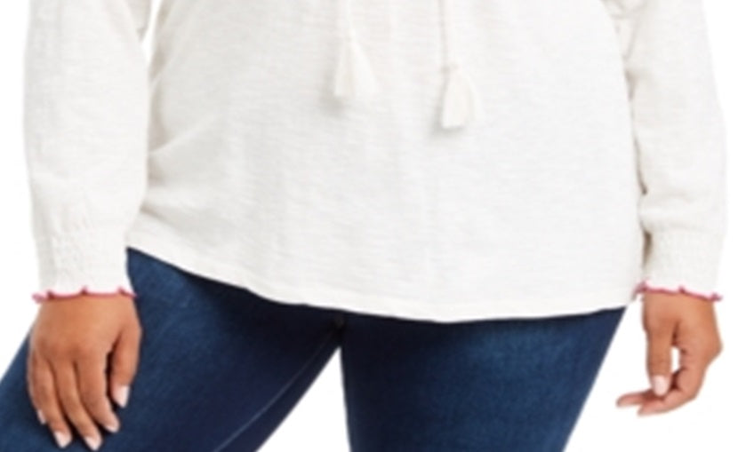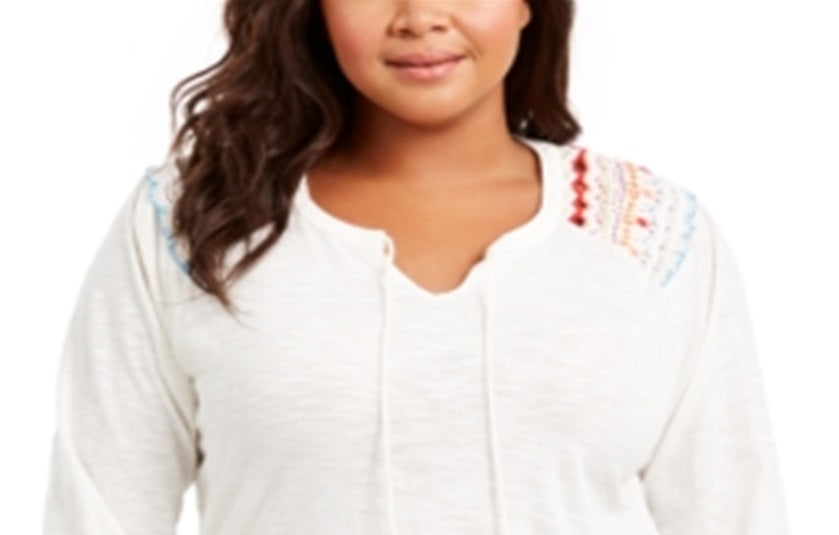 Style & Co Women's Plus Embroidered Cotton Tie Neck Top Fresh White Size 0X