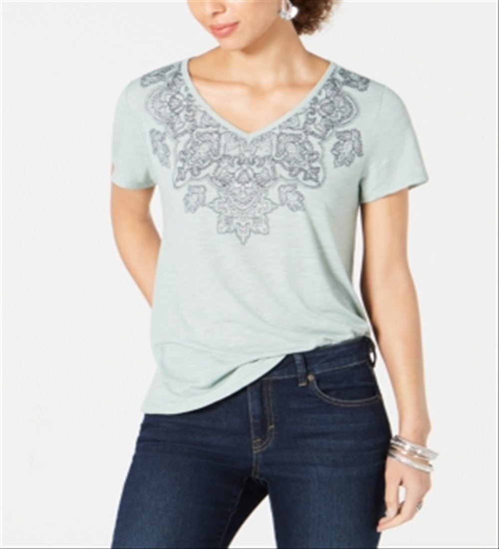 Style & Co Women's Printed V Neck T-Shirt Green Size Small