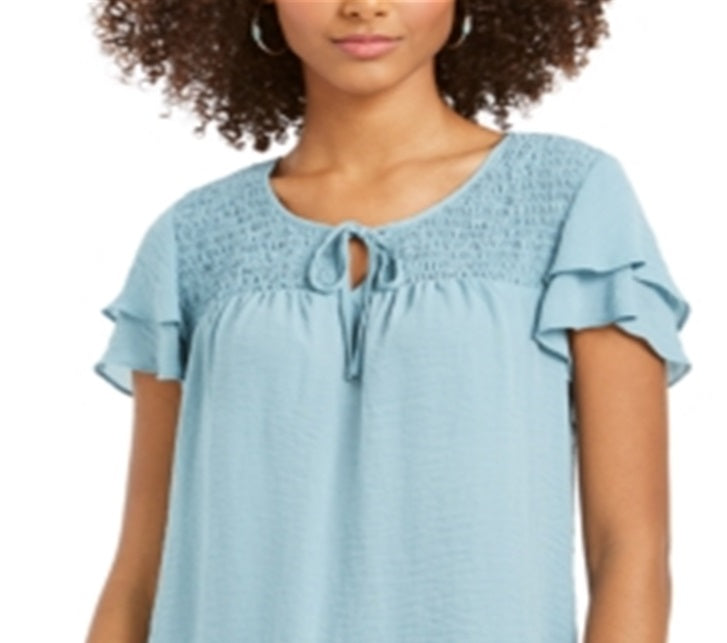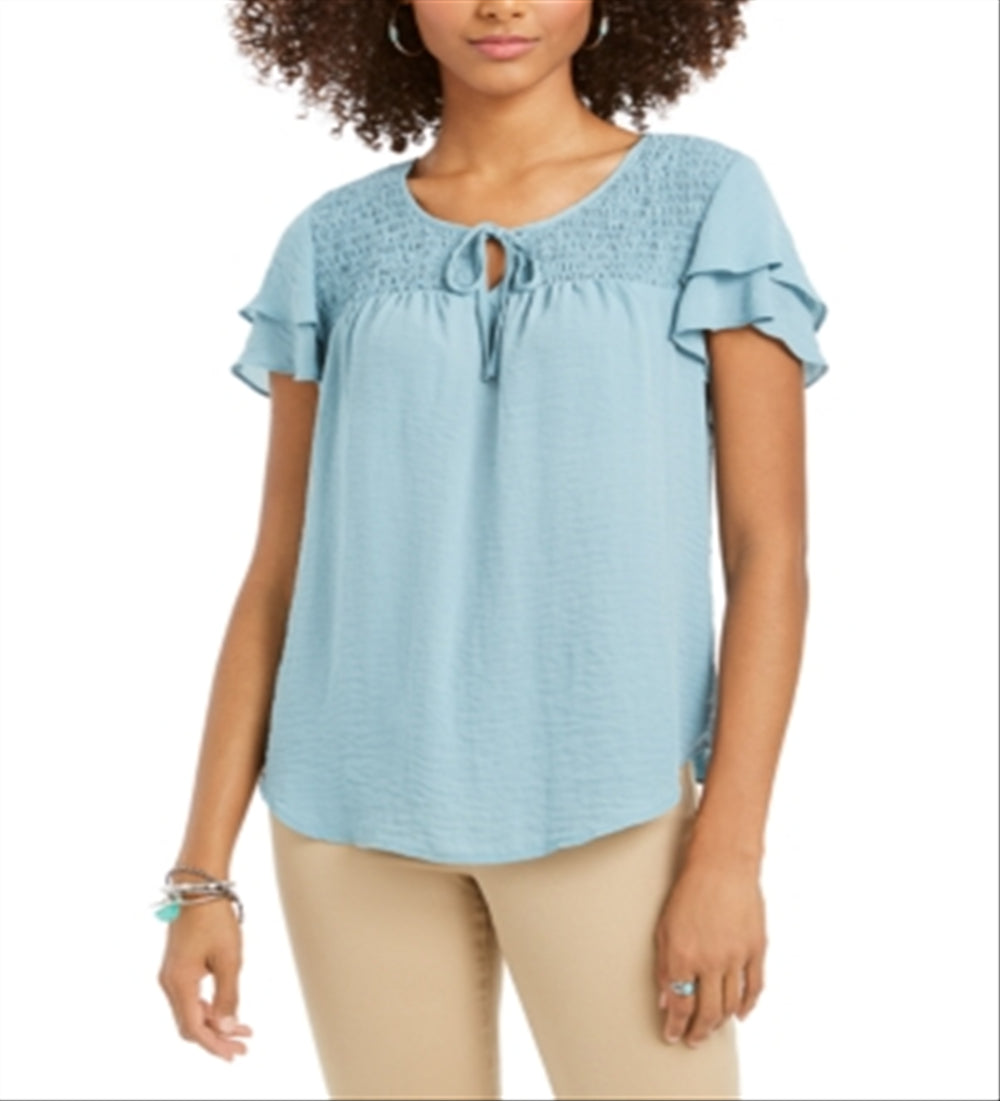 Elegant with a bit of boho| this Style & Co top features a smocked neckline and sheer flutter sleeves.| Relaxed fit| Due to generous sizing| we suggest sizing down for the perfect fit| Split neckline with tie