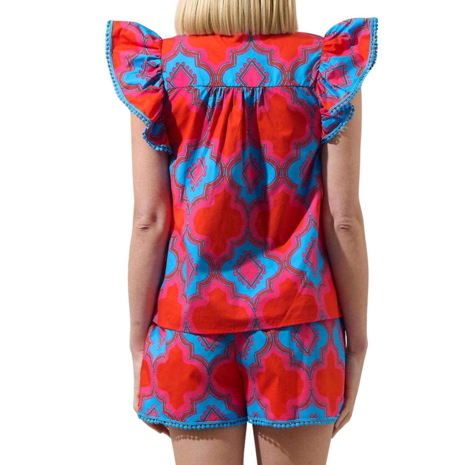 Embrace playful elegance with the Devany Mix Media Carya Ruffle Poplin Top by SUGARLIPS, a delightful addition to your wardrobe. This blouse features charming cap sleeves adorned with pom pom trim and a stylish split V-neckline. Made from soft cotton, it offers a comfortable fit with a garment length of 24.5 inches. Designed for convenience, this top boasts a pull-on closure, perfect for pairing with denim jeans and red heels.