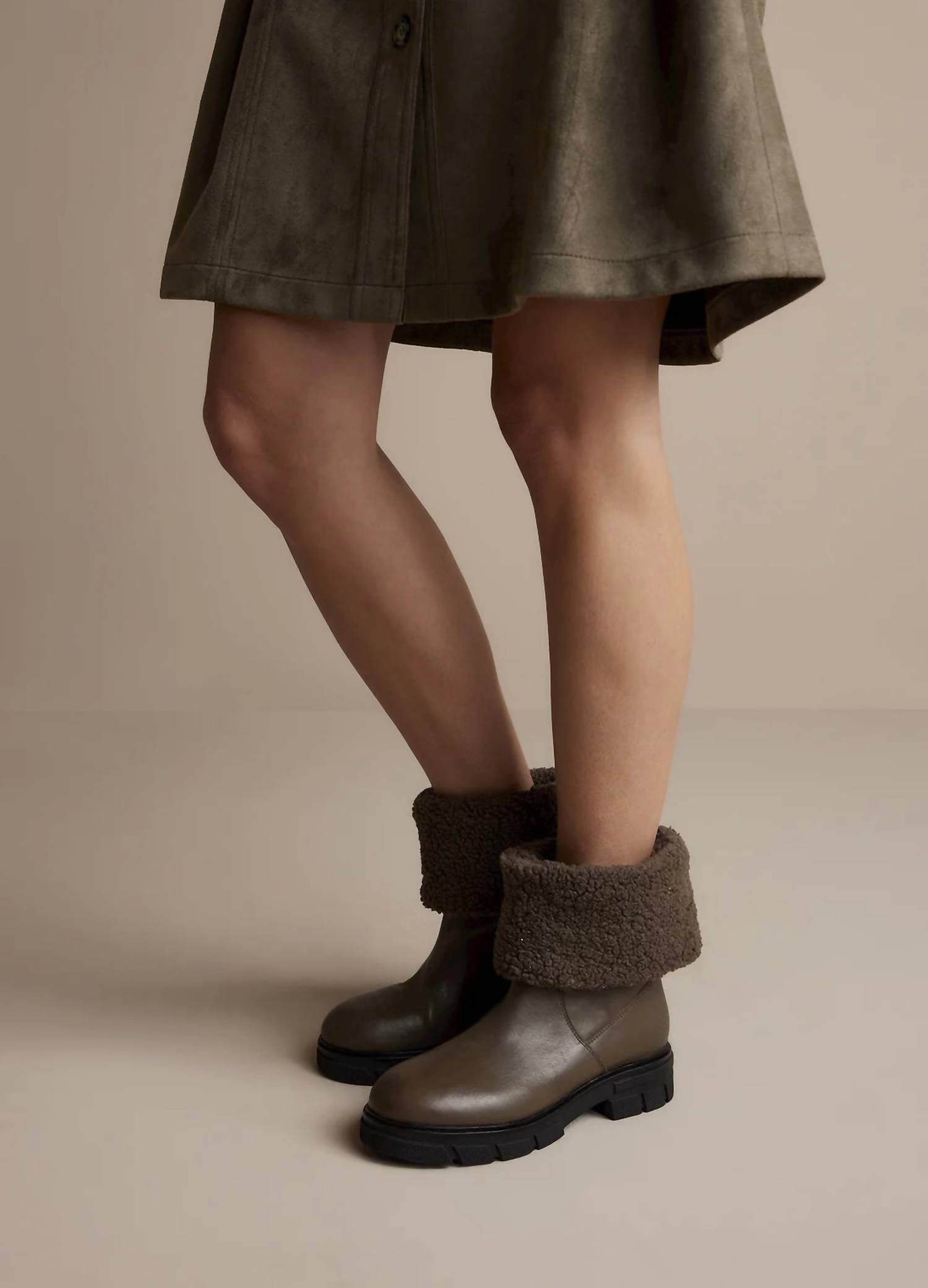 Say hello to the perfect, most versatile boot. The ankle height makes this style easily transition from day to night. Wear them with your favorite skinny jeans and tee for a more laid back look, or pair them with your favorite mini dress and jacket for a night out on the town.Leather boots with a teddy shaft and a chunky sole. The teddy fabric is foldable so you can create a somewhat shorter boot. 50% Leather 50% Polyester