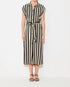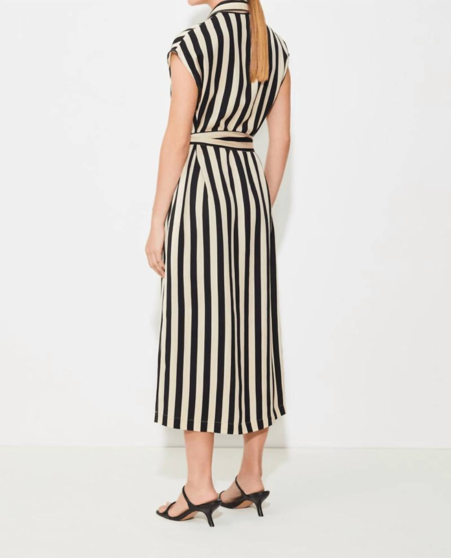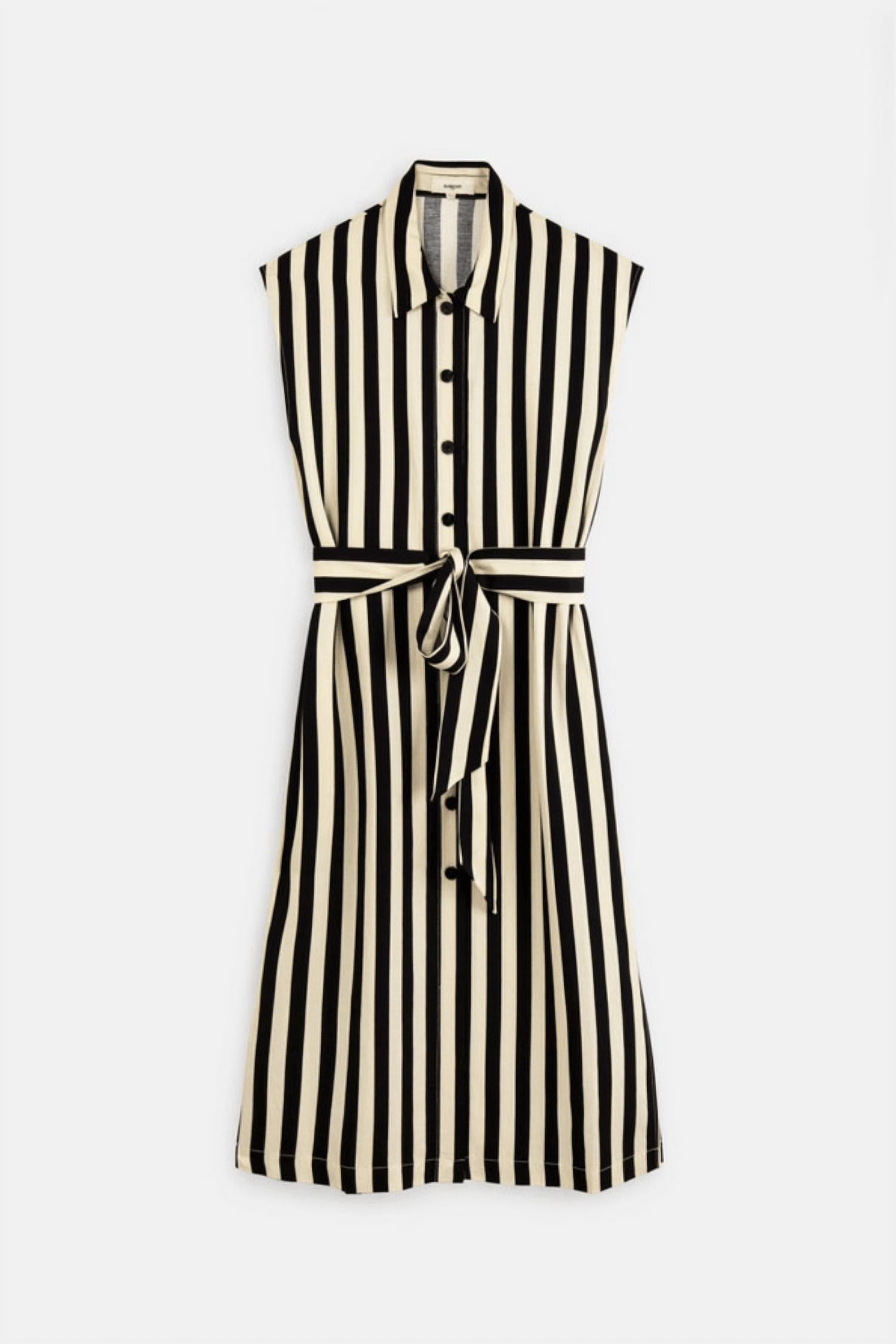 Introducing the Celest Midi Dress by Suncoo, a chic staple crafted for modern workwear. This black striped shirt dress features cap sleeves and a classic shirt collar with a front button closure. Made from a sustainable FSC viscose blend, it includes a removable tone-on-tone belt to tie and two side slits at the bottom for added movement and style. Care instructions recommend hand washing to maintain its elegant design.
