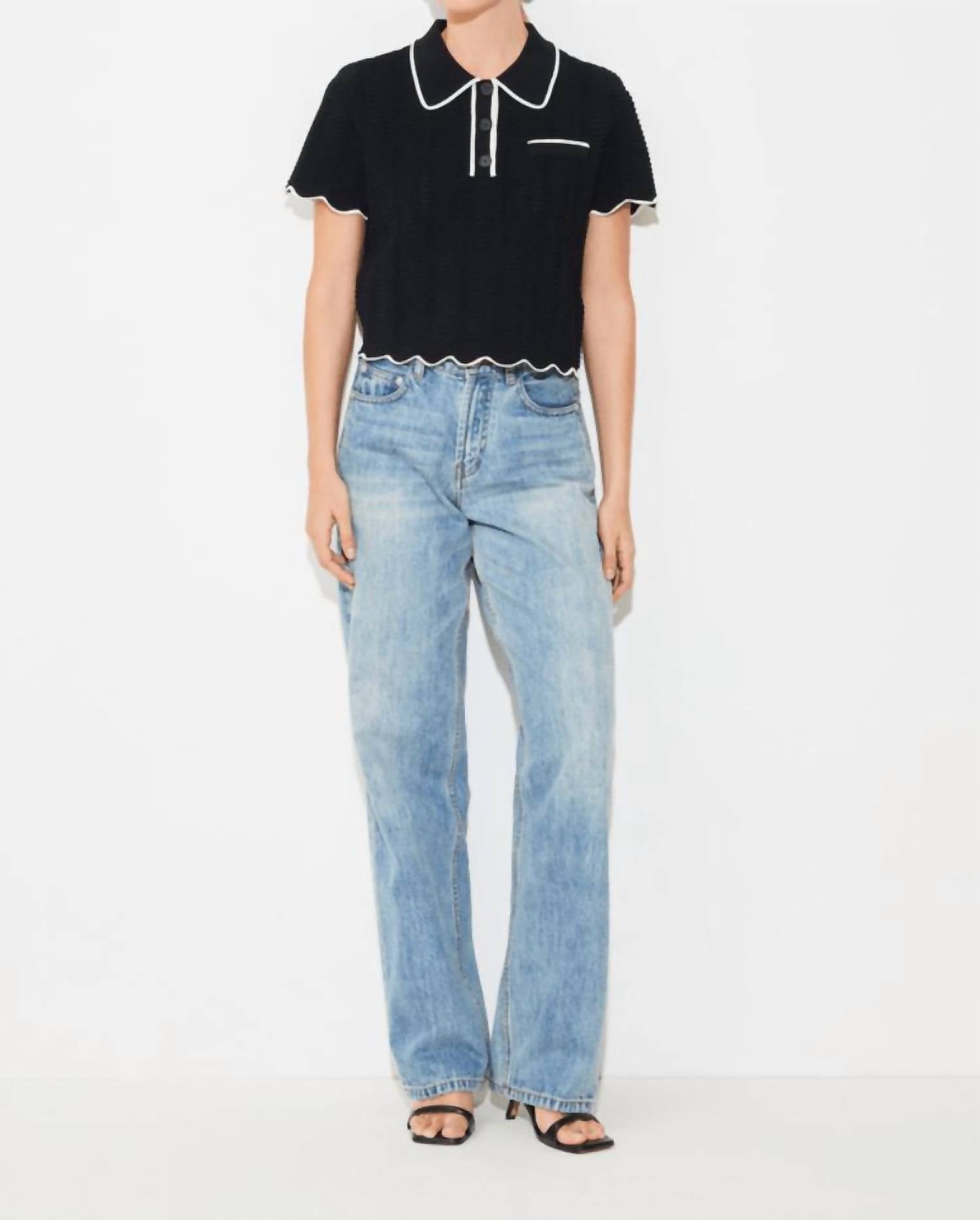 Experience the perfect blend of comfort and style with this trendy crew neck sweater, designed to effortlessly elevate your wardrobe. Pair it with your favorite denim and loafers for the perfect look. Introducing the Pikil Polo Short Sweater by Suncoo, a minimalist piece perfect for the spring season. Featuring short sleeves and crafted from an FSC-certified viscose blend, this women’s jumper combines 80% viscose and 20% polyamide for a comfortable fit. The versatile black design is enhanced with a polo collar, front button closure, and a chest patch pocket accented with scalloped details and white piping. Care for this solid-patterned sweater by hand washing as recommended.