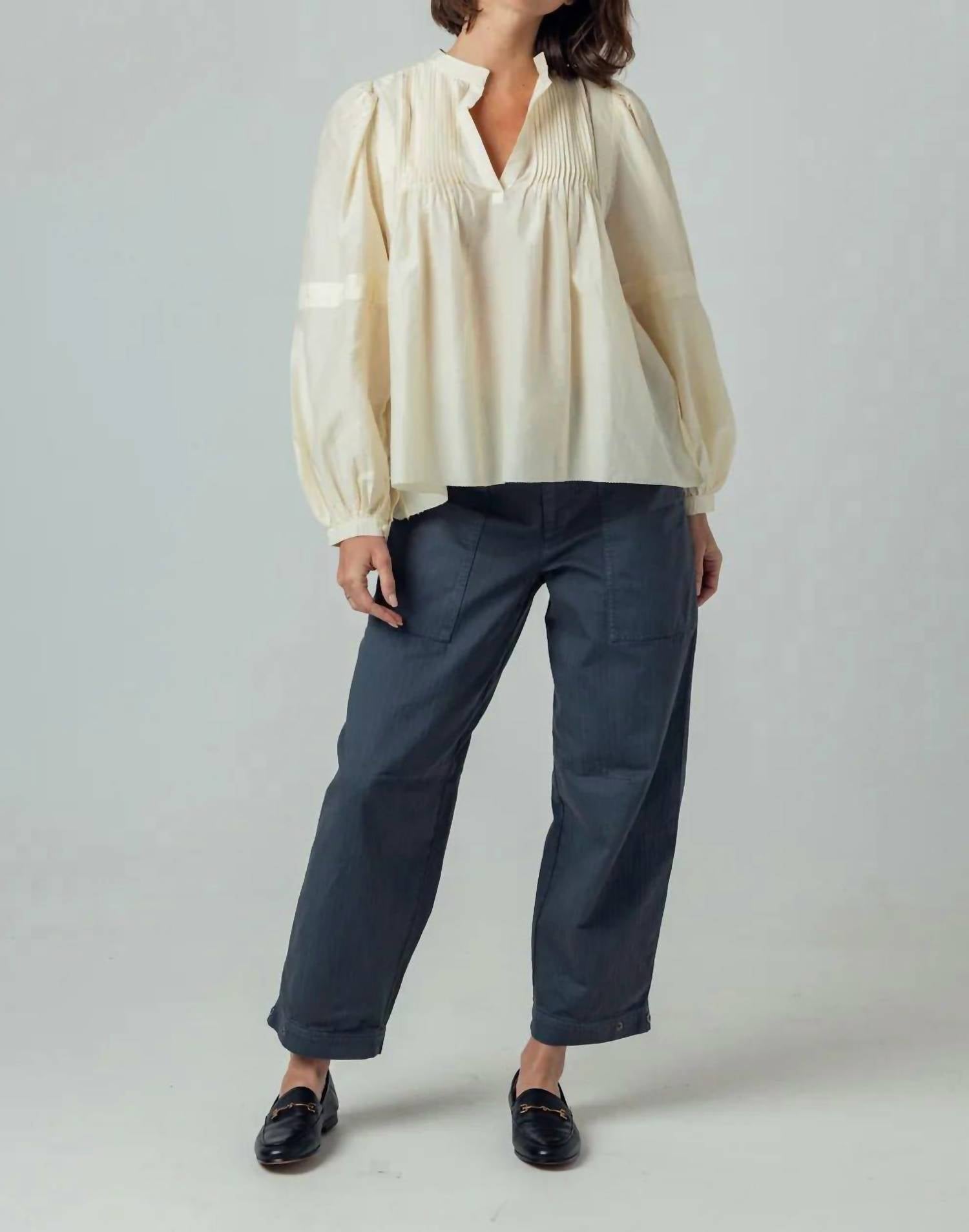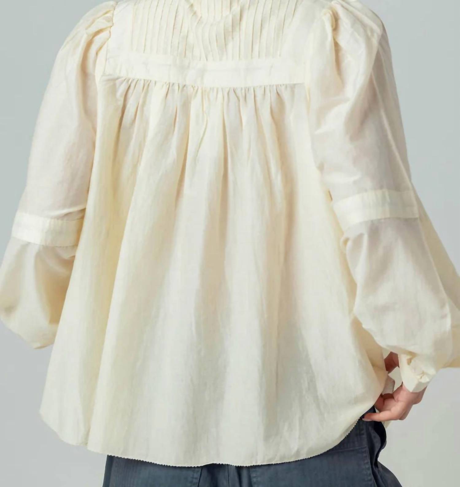 Introducing the Split V-Neck Maple Blouse by Sundays, a chic cream-colored piece perfect for early fall. This solid-colored blouse features long voluminous sleeves with buttoned cuffs, crafted from a luxurious blend of 80% cotton and 20% silk. Designed without a closure, it offers a pullover style for easy wear. Care instructions include a delicate wash in cold water, with a tumble dry on low setting.