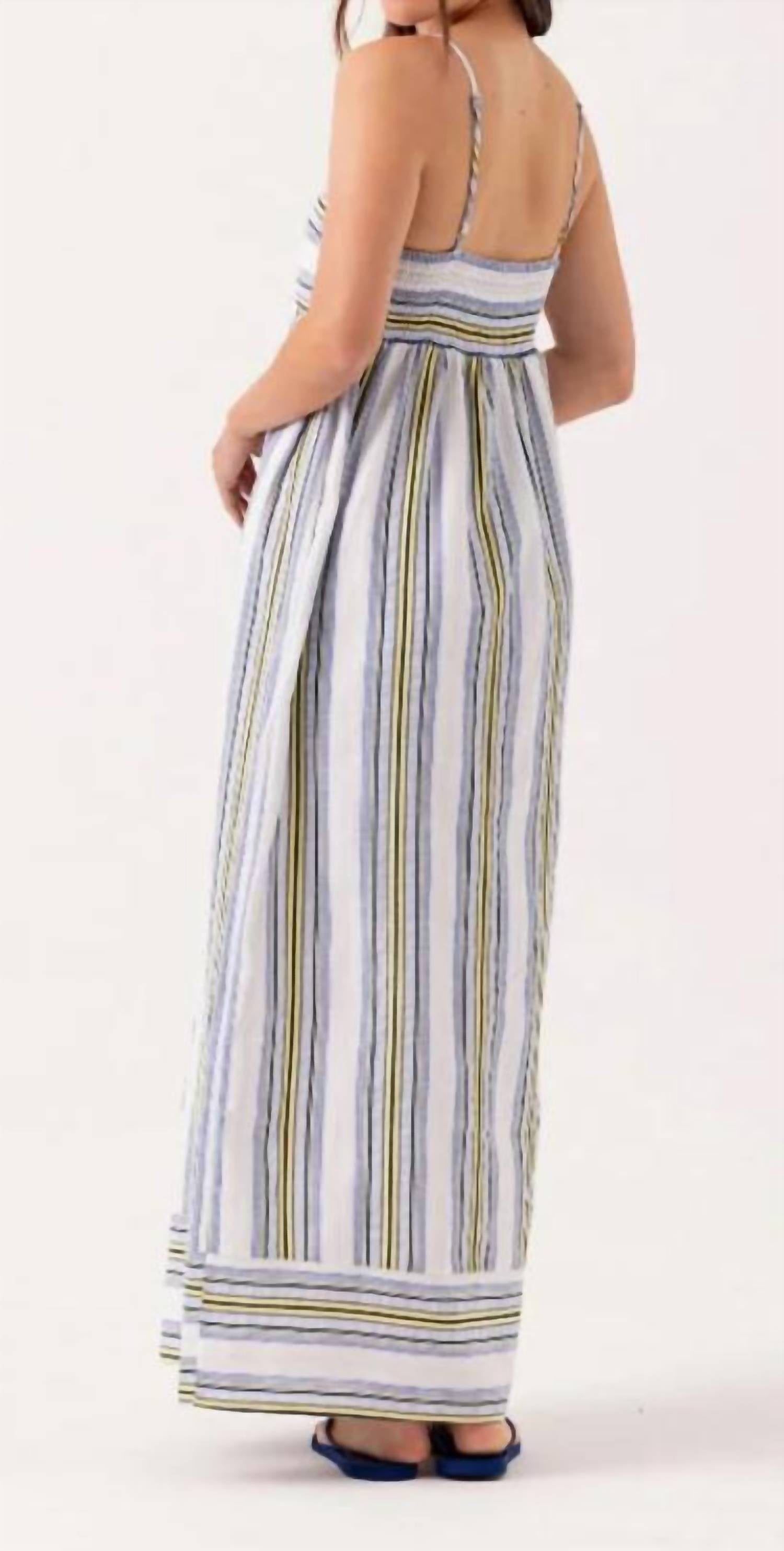 Style this maxi with your favorite statement necklace and sandals for the perfect look. Introducing the Tommy Dress, the perfect fresh addition to your summer wardrobe. This striped maxi dress is crafted from a linen cotton blend that ensures both comfort and breathability for the warmer months. The bright and refreshing Yacht Stripe creates the perfect color combination to take you to any destination. With a fitted bodice featuring gathers under the bust, Tommy creates a flattering modern empire silhouette. A full length dress, Tommy will sit just at the top of your foot, providing the option to style with flat or heeled shoes. 50% Cotton 40% Tencel 10% Linen Machine wash cold, tumble dry low. Linen has a tendency to wrinkle, for best results, lightly press.