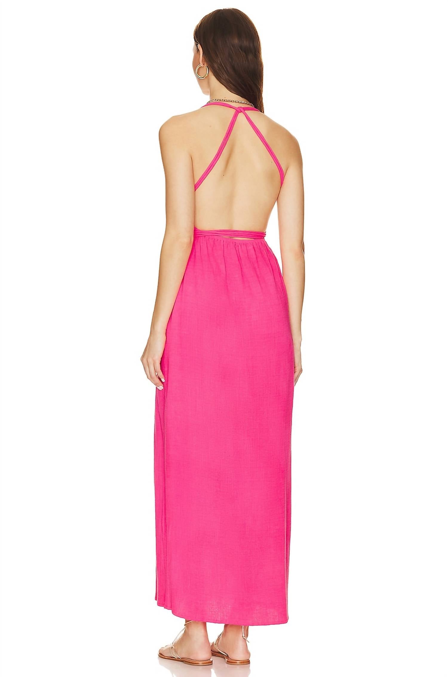 Who doesn't love a good maxi dress? This one you'll be reaching for season after season. The Sybille Dress features a stylish wrap tie closure and a plunging neckline, creating a flattering silhouette. Made from midweight gauze fabric, it includes a side seam slit for added movement and flair. Composed of 100% cotton, this dress is unlined for a lightweight feel. For care, dry cleaning is recommended. The model stands at 5'9" and is wearing a size S, with the shoulder seam to hem measuring approximately 52.36 inches in length. Made in India.