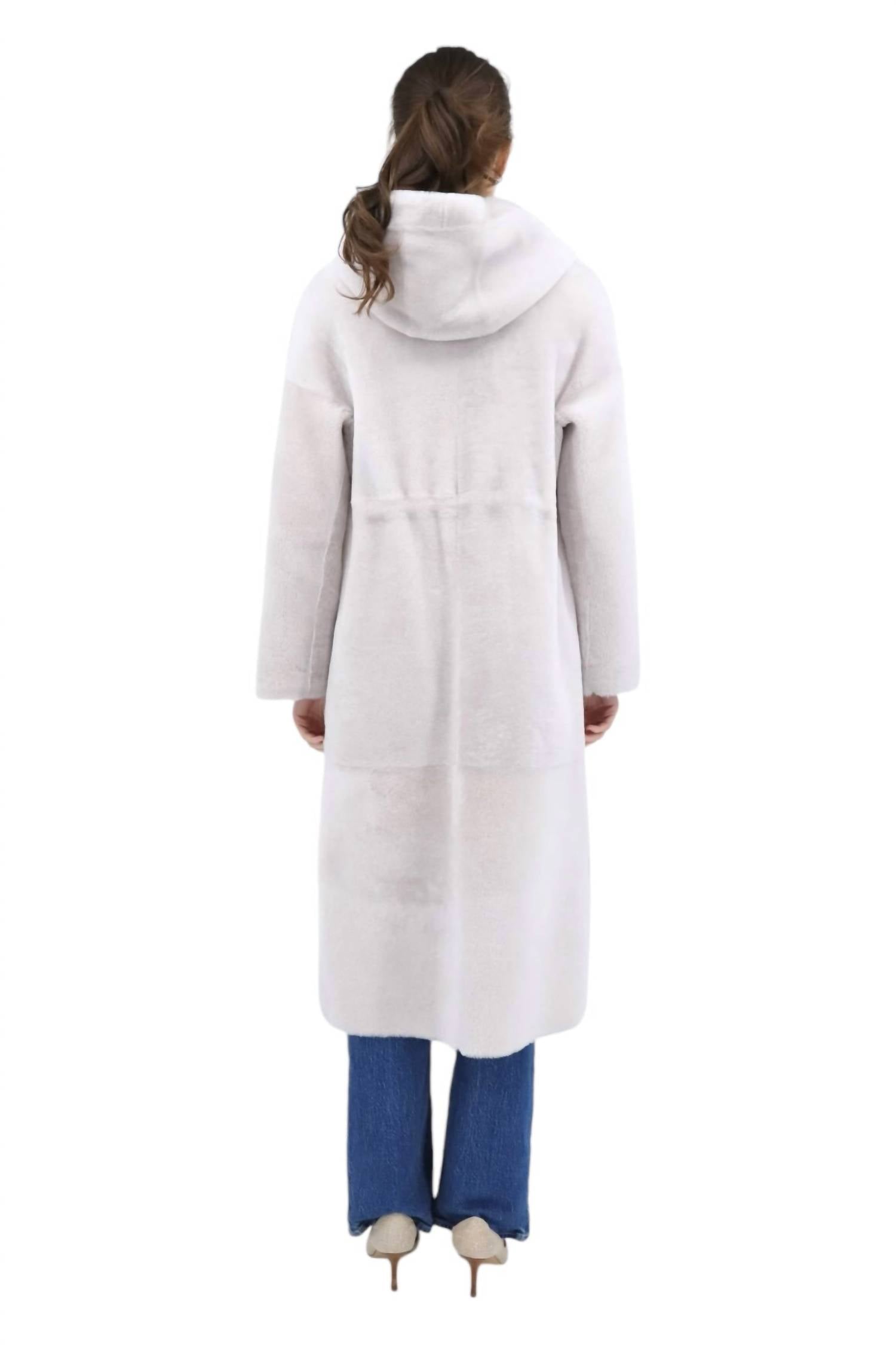 Introducing the Suprema Reversible Shearling Coat in an elegant Ghiaccio shade for the ultimate in luxury and warmth. This minimalist and versatile winter coat features long sleeves and a convenient button closure, allowing for different styling options with its reversible design. Crafted entirely from soft shearling, it offers supreme comfort. Perfect for any winter vacation or Christmas outing.