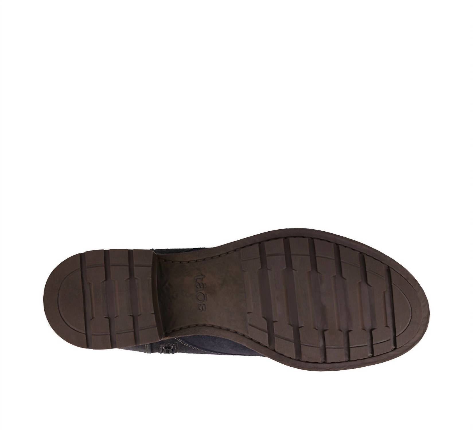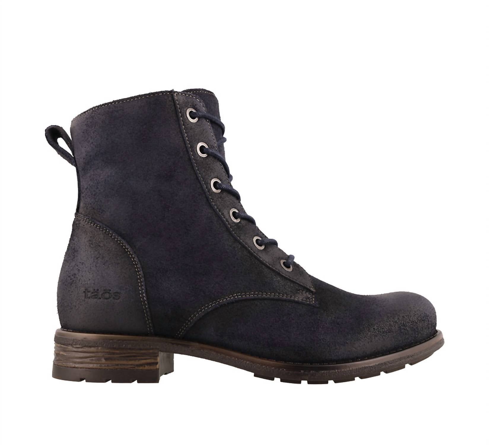 Say hello to the perfect, most versatile boot. The ankle height makes this style easily transition from day to night. Wear them with your favorite skinny jeans and tee for a more laid back look, or pair them with your favorite mini dress and jacket for a night out on the town. Embrace rugged style with the Women's Combat Boot by Taos, crafted to offer all-day comfort in a chic navy hue. Built with a suede upper, this boot features detailed stitching for a Western trend. It includes an inside zipper closure with a lace-up front and a supportive removable footbed for enhanced arch and metatarsal support. The round toe and chunky low heel offer a heel height of 1.25 inches, ensuring both stability and style whether you're at a concert or out on the town.