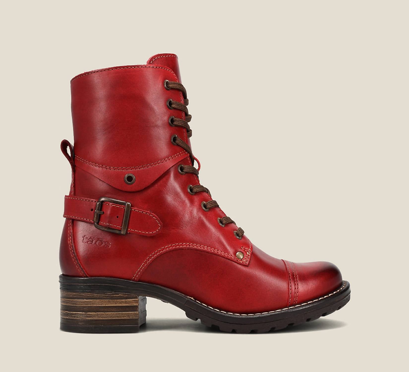 A stylish lace-up boot with a comfortable fit and classic design. Versatile enough to wear with almost every outfit, your closet and feet will be thanking you. Experience unparalleled comfort with the Womens Crave Boot by Taos, expertly crafted for the urban explorer. Designed in Portugal, this lace-up boot in Classic Red features a round toe and a block heel measuring 2 inches. The luxurious faux fur and leather lining, paired with the Curves & Pods® dual-density removable footbed, ensure a comfortable fit with every step. Ideal for summer vacations, this vintage-inspired boot effortlessly adapts to any adventure in the concrete jungle.