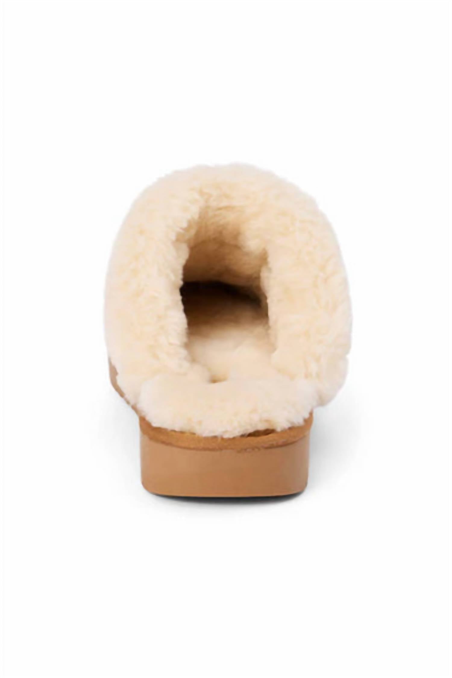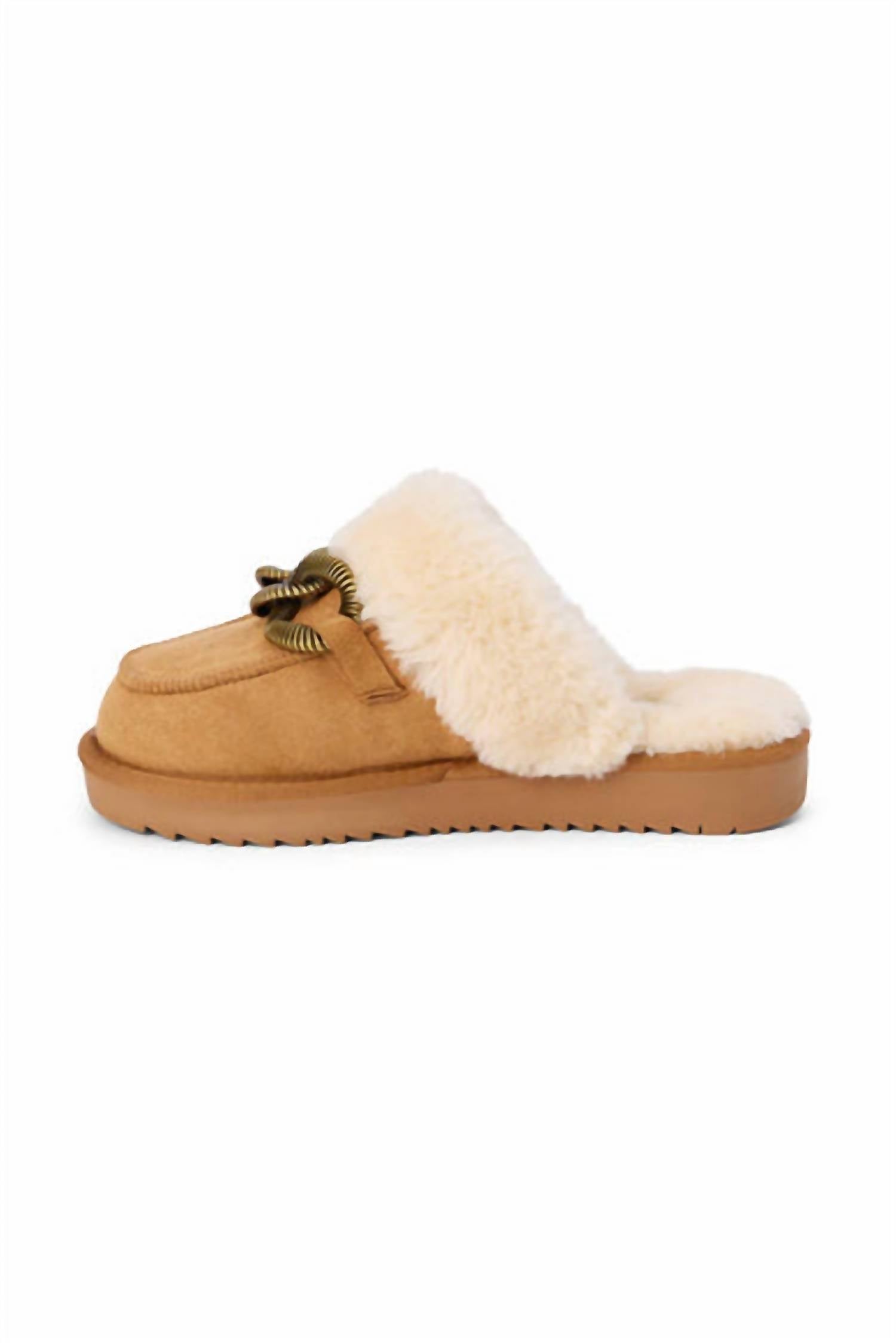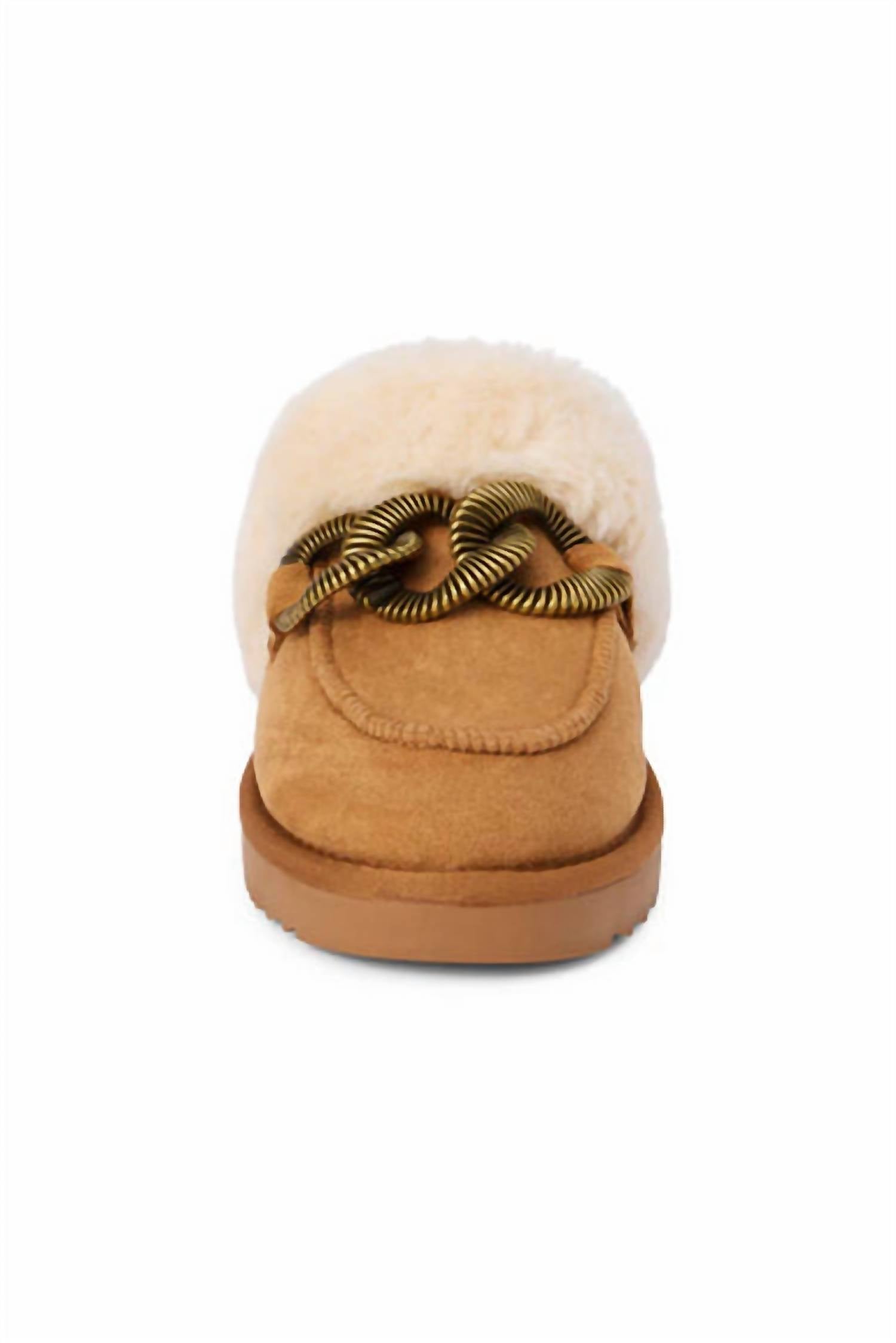 Slip into these, we promise you won't regret it. Step into comfort with Taos Women's Fur Slipper in Chestnut color, designed to bring luxury to your relaxation. This slipper showcases a soft camel faux suede upper complemented by an elegant gold chain detail. The round toe and flat heel, measuring 1.5 inches, ensure a stylish yet comfortable experience. Featuring a plush faux fur lining and easy slide-on style, these slippers are ideal for both cozy lounging and quick trips out.