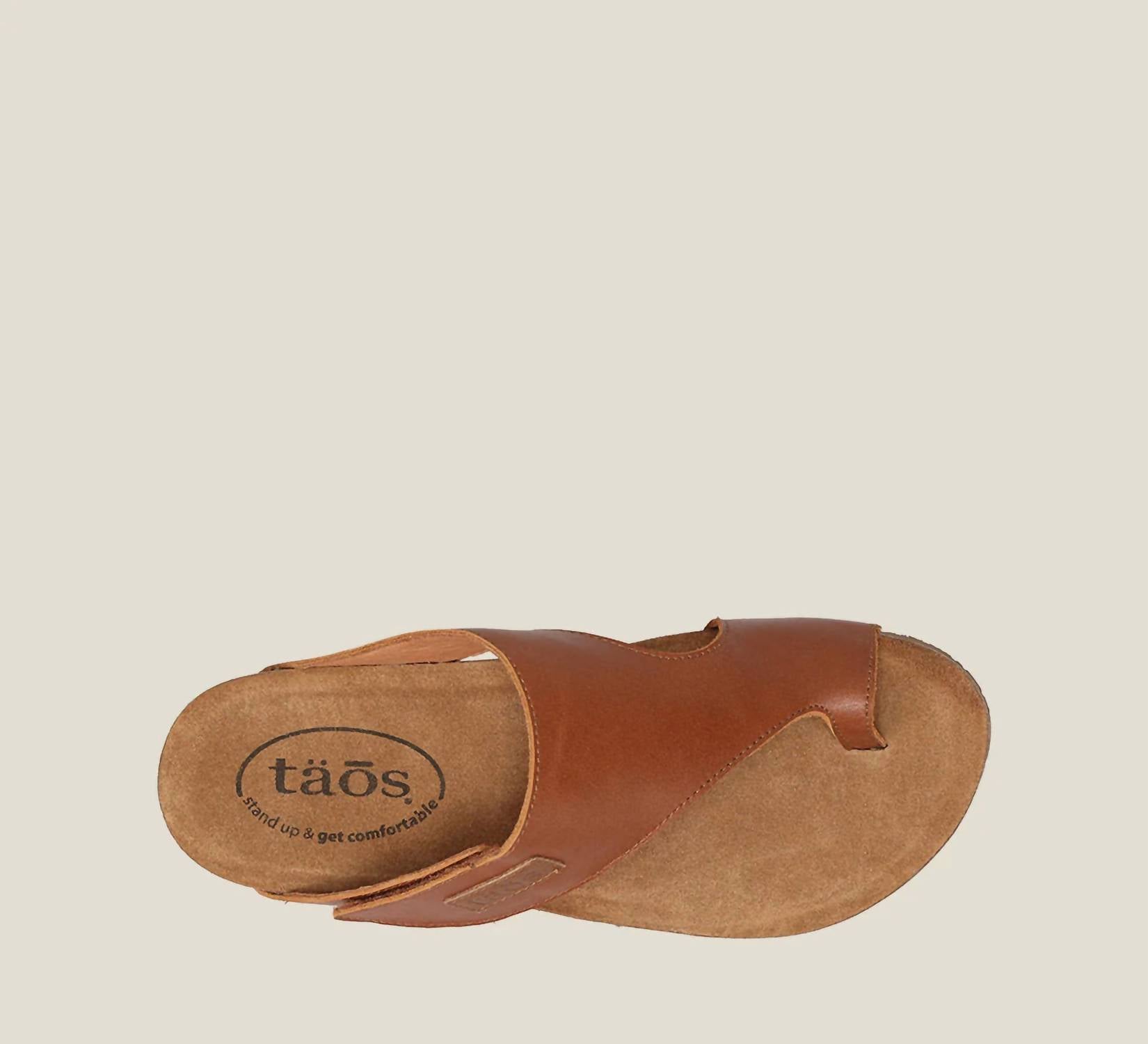 Classicly cute and all-day-wearable. We love this sandal. Elevate your summer style with the Taos Women's Loop Sandal in Brandy, a perfect blend of comfort and elegance. Crafted from premium European leather, these sandals feature an open toe design and a low heel height of 1.75 inches. The adjustable hook & loop closure ensures a secure fit, while the cushioned cork footbed and suede lining provide exceptional arch and metatarsal support. Care is simple with buffing using a leather cleaner or polish, and wiping with a dry cloth. Enjoy the boho chic trend with durable rubber outsoles for all-day stability.
