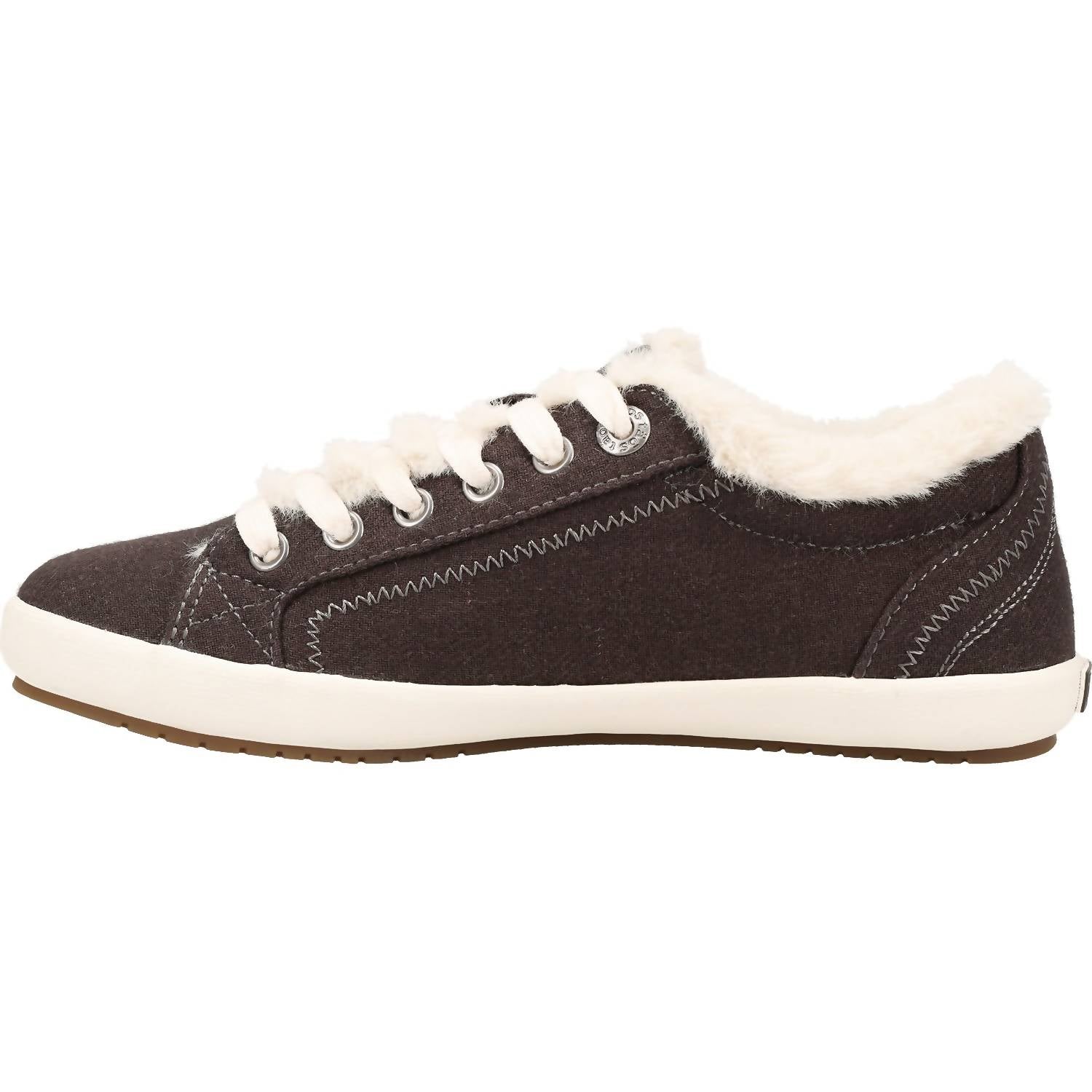 Get your daily steps in with these adorable sneakers. Experience everyday comfort and style with the Women's Starline Canvas Sneakers by Taos in a versatile charcoal hue. These medium-width shoes are thoughtfully designed with a flexible, durable rubber outsole and a round toe shape, making them ideal for all-day wear. The canvas upper is complemented by a luxurious faux fur interior, providing warmth and comfort, while the antimicrobial shield footbed and arch support ensure hygiene and support. Finished with a flat heel measuring 3/4", these sneakers are perfect for travel and fall adventures.