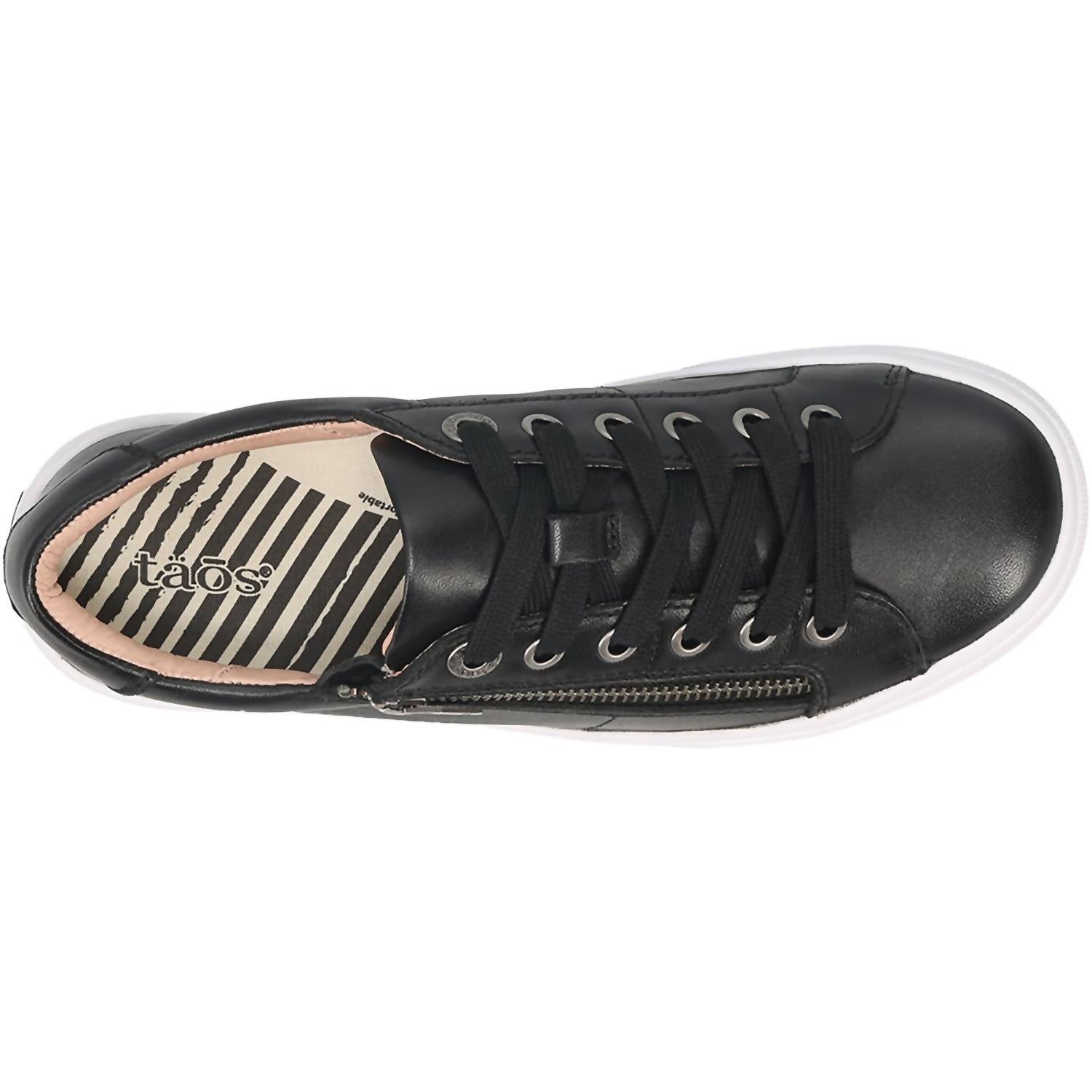 Cute, functional, and comfortable. These sneakers check all the boxes. Experience style and comfort with the Women's Z Soul Lux Leather Sneakers by Taos, crafted from premium black leather. Enhanced with an outside zipper and laces, these sneakers offer both easy access and a personalized fit. Featuring a Curves & Pods® removable footbed for arch and metatarsal support, and an antimicrobial shield, these shoes are ideal for all-day wear and any adventure. With a heel height of 1", a flexible rubber outsole, and orthotic-friendly features, the Z Soul Lux sneakers are a perfect blend of function and fashion.