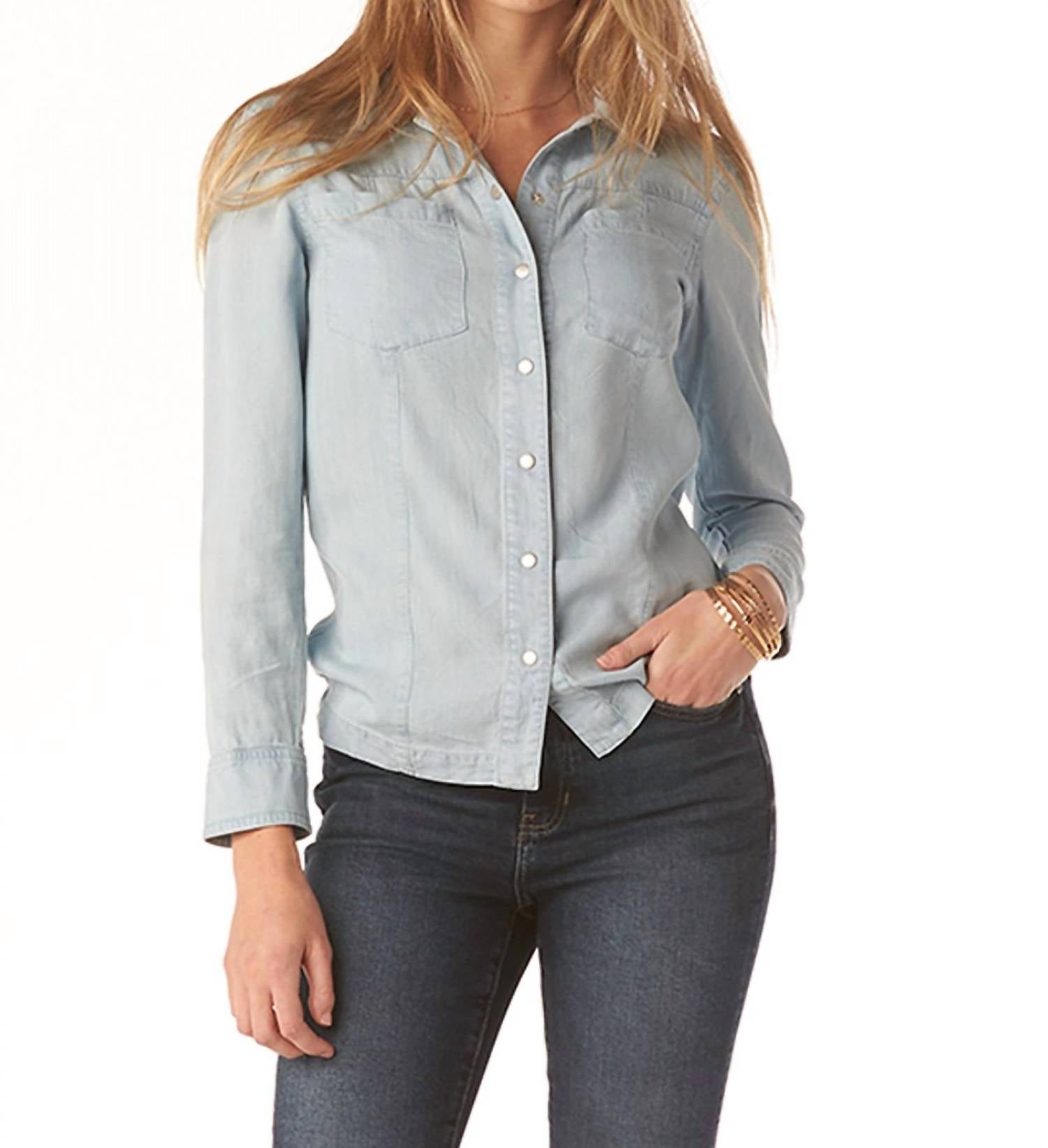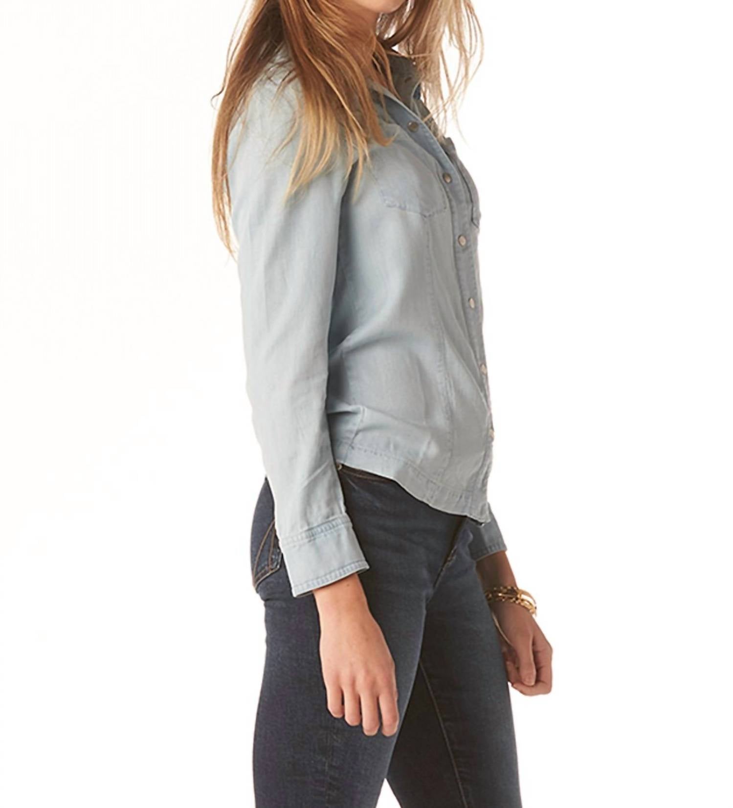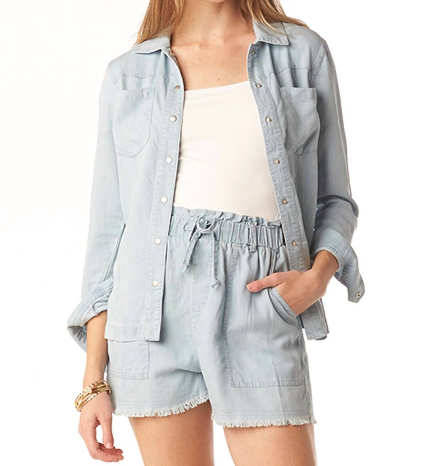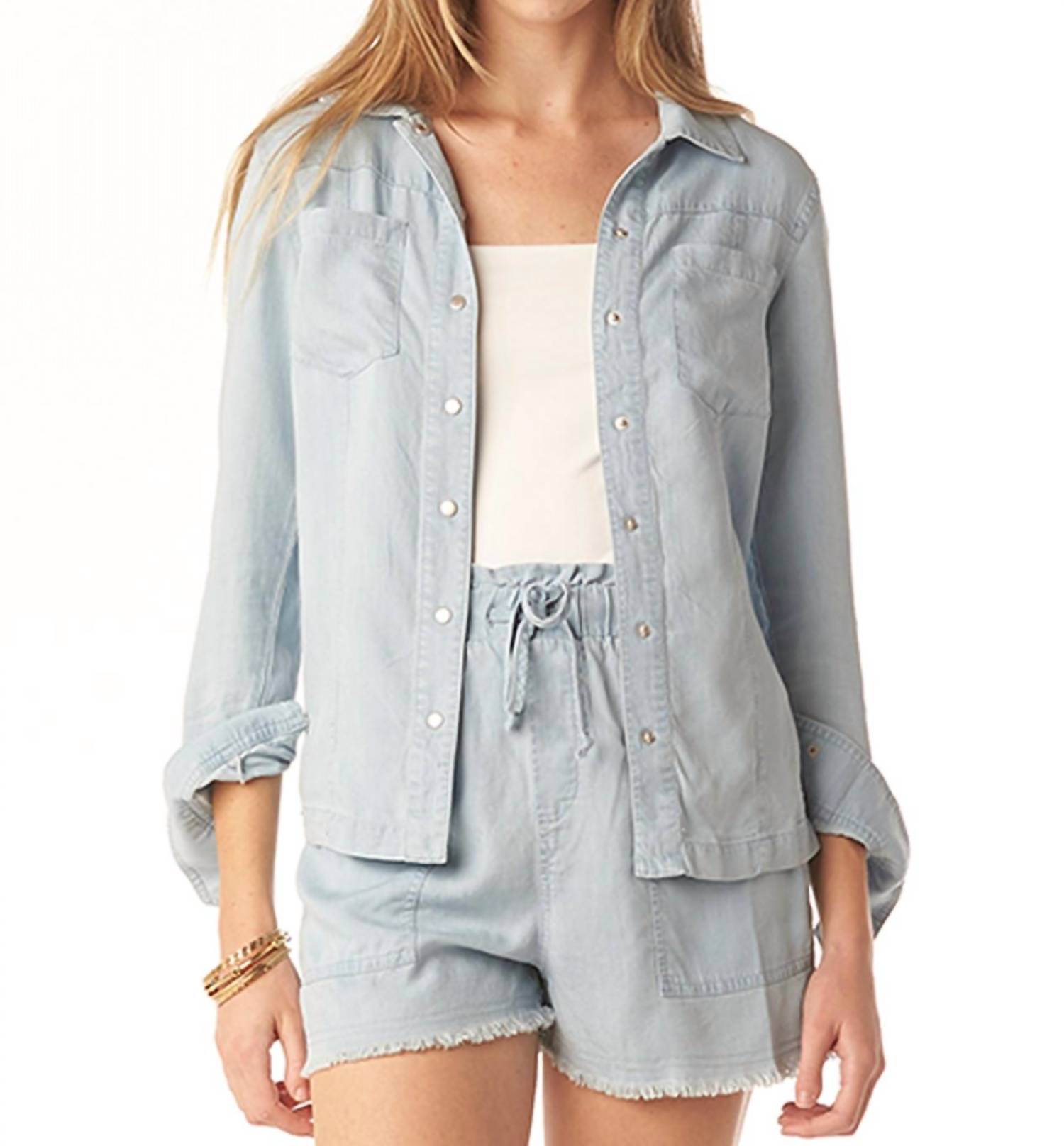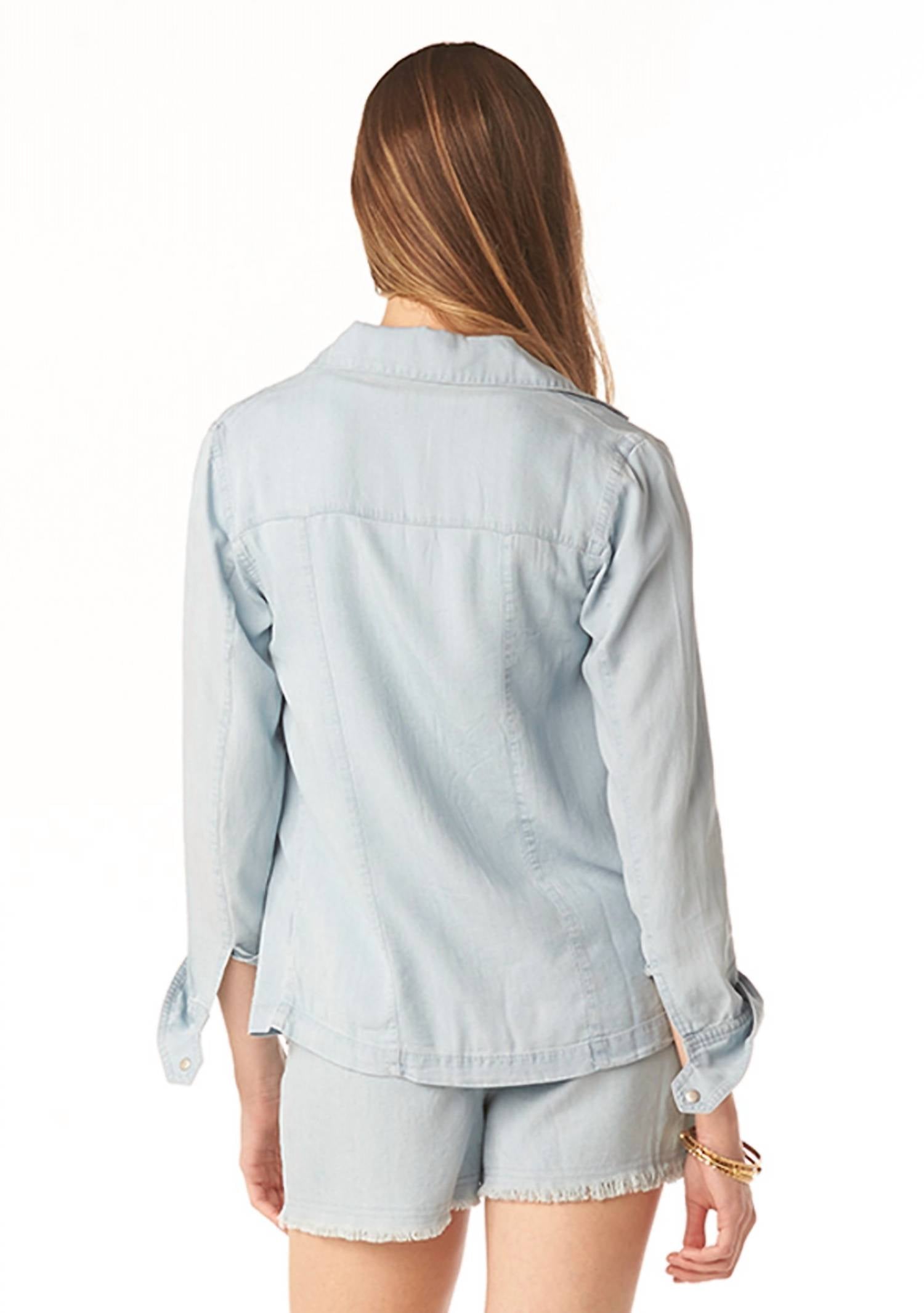 A classic button down shirt that will never go out of style. The Francesca Shacket by Tart Collections is a stylish addition to any wardrobe, crafted from 100% Tencel in a classic Open Air Blue with a solid pattern. This long sleeve button-down shirt combines versatility and timeless appeal, featuring a collar neckline. Closure type: Button Closure. Care: Machine wash cold on a delicate cycle, use mild detergent, do not bleach, lay flat to dry; low iron if needed or dry clean. Model is 5'8" and wearing a size X-small.