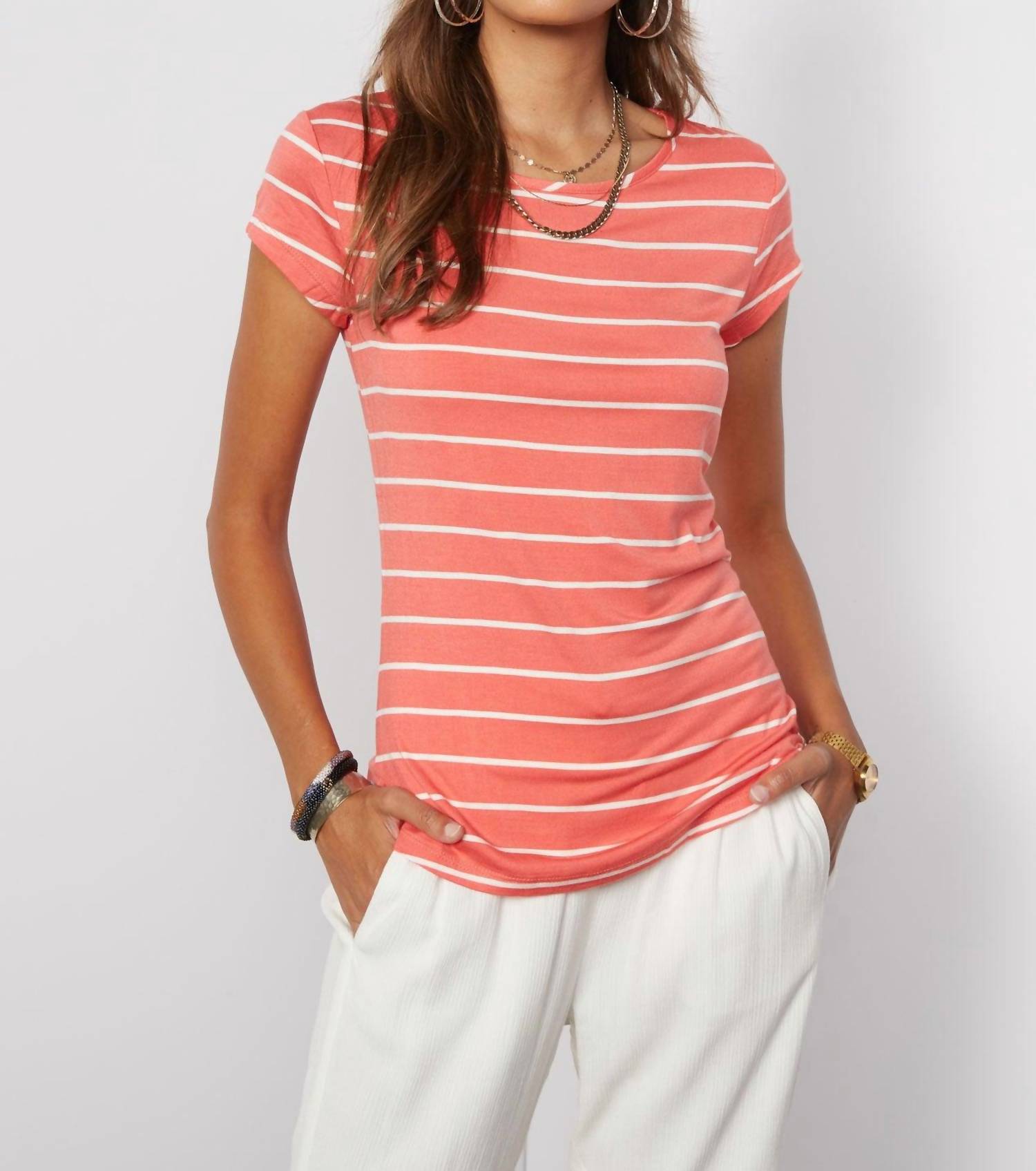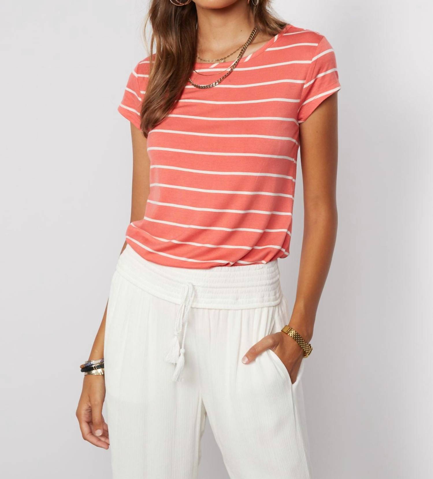 Introducing the Lillie Top by Tart Collections, a stylish tee in a Coral/Off White Stripe perfect for a fresh, casual look. This women's top features short sleeves and a classic crewneck, making it an easy choice for everyday wear. With a convenient pull-on closure, it's effortlessly wearable with no fussy zippers or buttons. The model is wearing a size x-small, standing at 5'9" with measurements of 32" bust, 23" waist, and 34" hips.