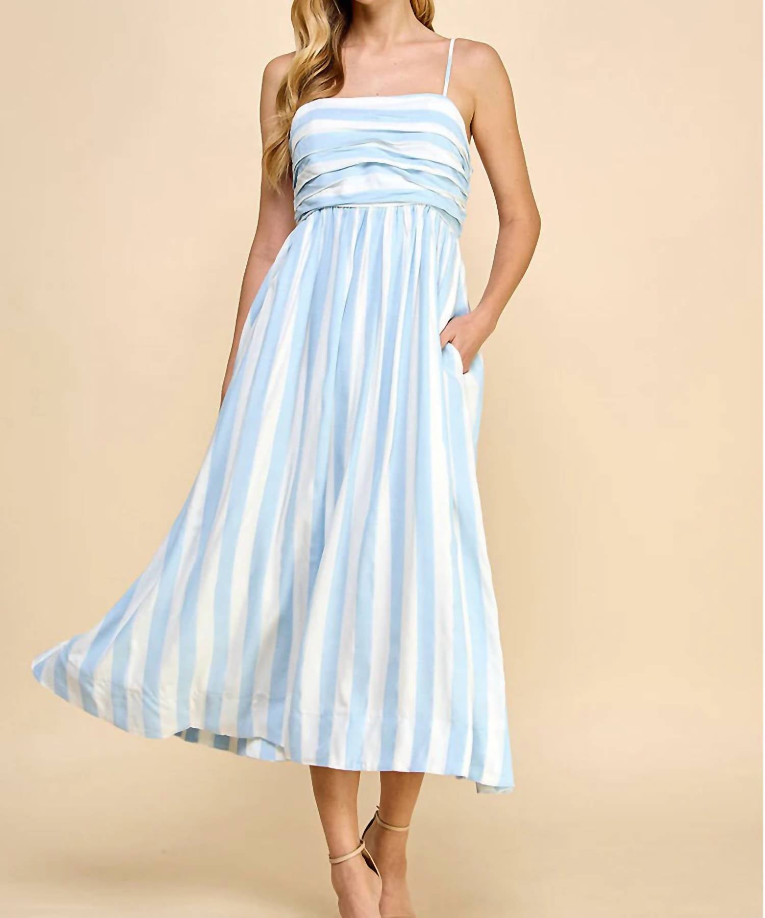 A midi dress so versatile, your options for wearing it are endless. Step into summer elegance with the TCEC Carolina Seaside Maxi Dress, a boho-chic choice for beach days and more. This sleeveless, striped dress boasts a sophisticated squareneck and an A-line silhouette for a flattering fit. Made from a blend of 60% Rayon and 40% Tencel, it offers both comfort and style. Featuring a convenient pull-on closure and handy pockets, it's easy to maintain with hand washing. Designed for a classic transition, it pairs perfectly with a denim jacket. Model is 5’10” wearing size small, and the fit runs true to size.