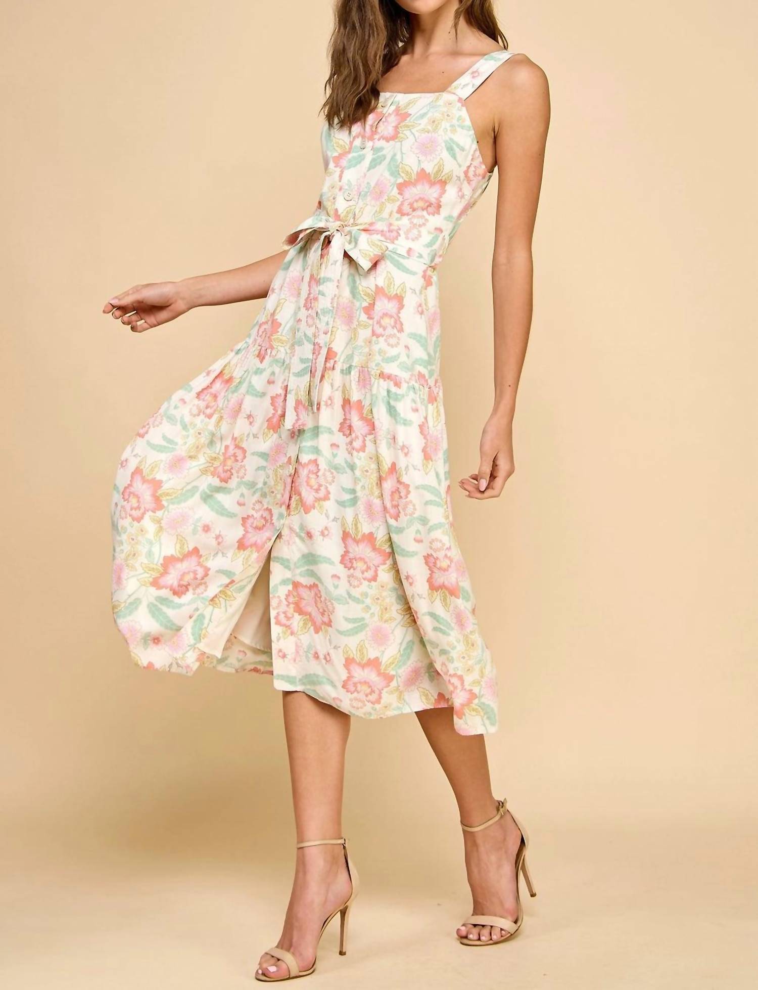 A midi dress so versatile, your options for wearing it are endless. Discover the Darling Moment Floral Button Down Midi Dress by TCEC, a perfect blend of boho chic and vacation-ready style. This sleeveless A-line dress showcases a vibrant floral pattern and features a square neckline with a flowy hem, enhanced by an attachable belt for a tailored fit. Composition: 85% Rayon, 15% Linen. Closure: Button closure. Care: Hand wash. Ideal for those sunny spring days where style meets comfort.