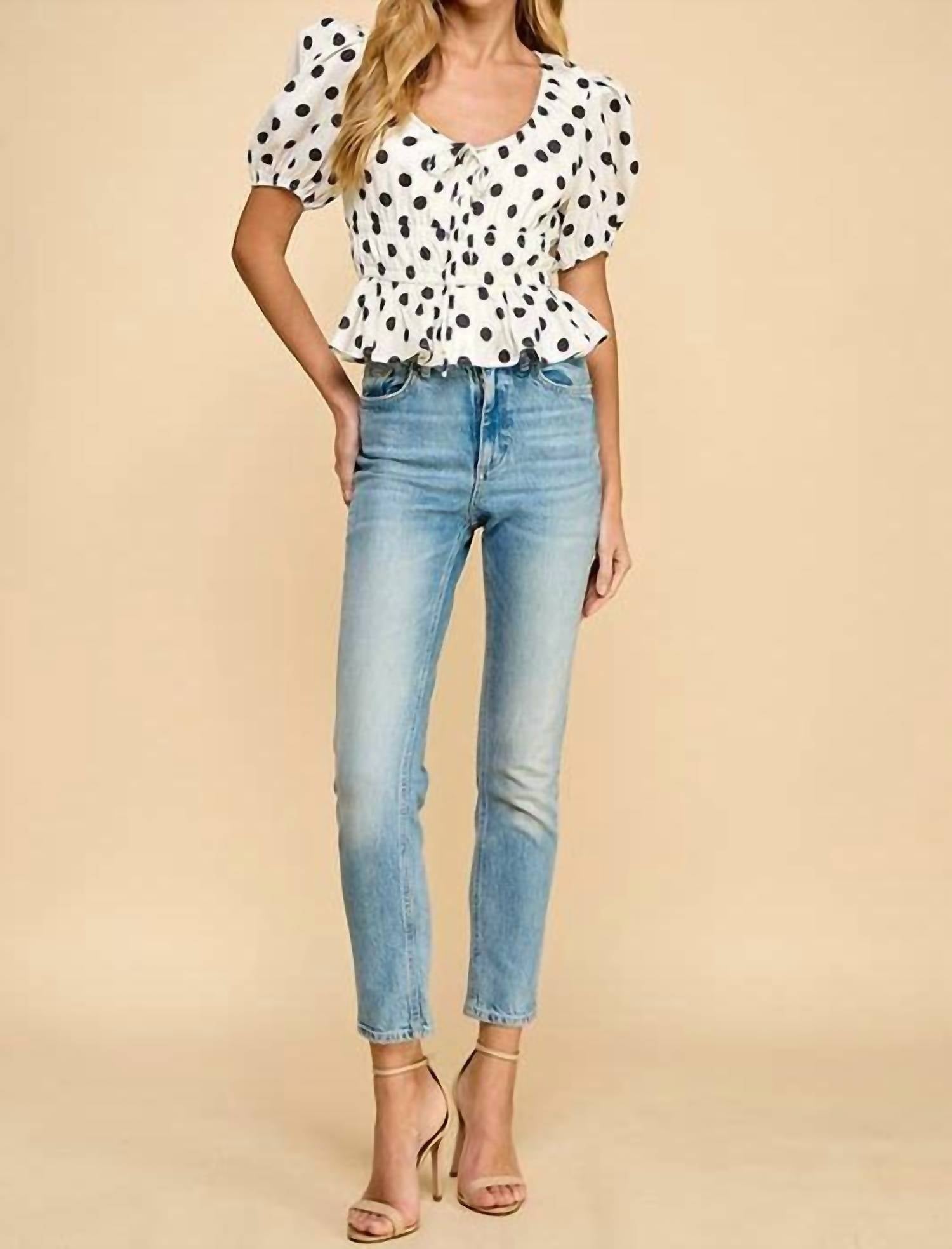 Introducing the Polka Dot Print Scoop Top by TCEC, a chic addition to your wardrobe perfect for music festivals and spring outings. This blouse features short puff sleeves and a flattering elastic waist with a smocked bodice. The peplum hem and chest tie add a touch of flair to its polka dot design. Composition: 100% Polyester. Closure: Tie closure. Care: Machine wash cold, tumble dry low. Model is wearing a size small (5'9" height, 33" bust, 25" waist, 34" hips).