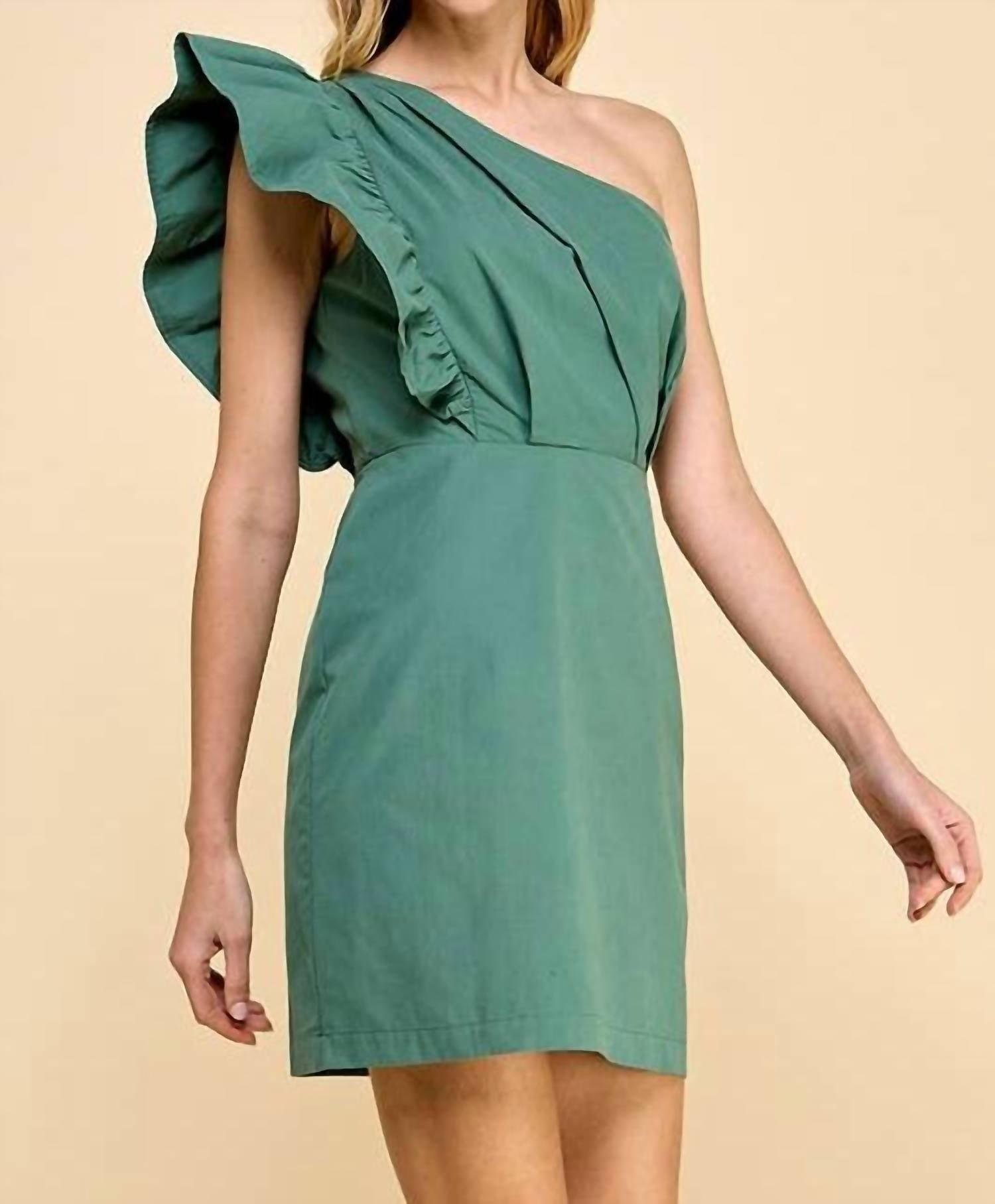 The kind of easy and flattering dress you'll be reaching for all season long. Presenting the Ruffle Sleeve Mini Dress by TCEC in a vibrant green hue, crafted for sophisticated allure. This women's shift dress features a playful one shoulder design with a cap ruffle sleeve, enhancing its asymmetrical silhouette. The dress is made with a side zipper closure, ensuring a sleek and seamless fit. Designed without pockets, this solid-patterned piece is tailored for an elegant look, perfect for any occasion. Model is wearing a size small (5'9" height, 33" bust, 25" waist, 34" hip).