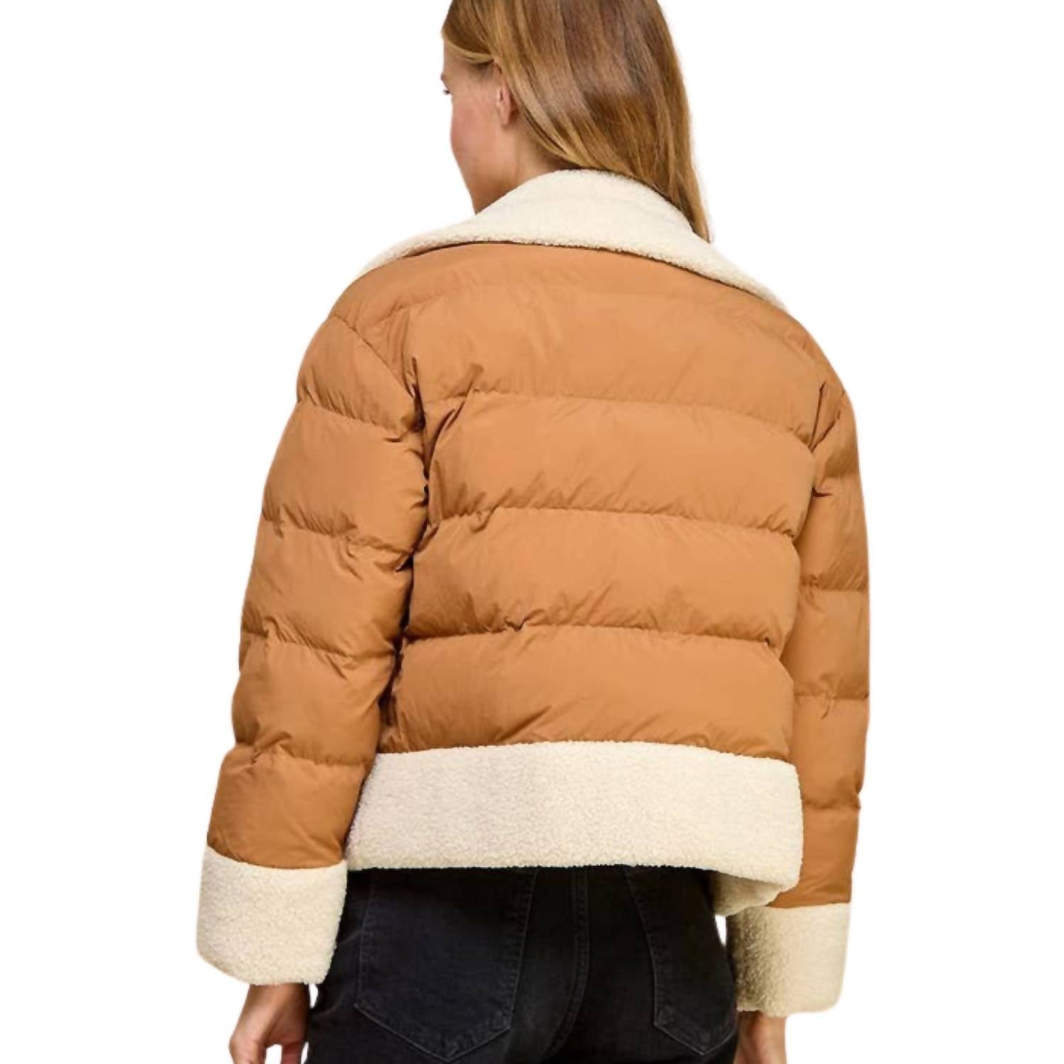 You'll be reaching for this puffer jacket all season long. Introducing the Sherpa Trim Padded Puffer Jacket by TCEC, expertly crafted to provide unparalleled warmth and style in colder weather. This long-sleeve puffer jacket features a textured pattern in a sophisticated brown and cream palette and is detailed with plush sherpa trims along the collar and cuffs, adding an element of luxury. Practical side pockets offer convenience, while the asymmetrical zip closure creates a modern and edgy silhouette. Perfect for layering over your favorite winter outfits, this piece effortlessly combines comfort, fashion, and functionality.