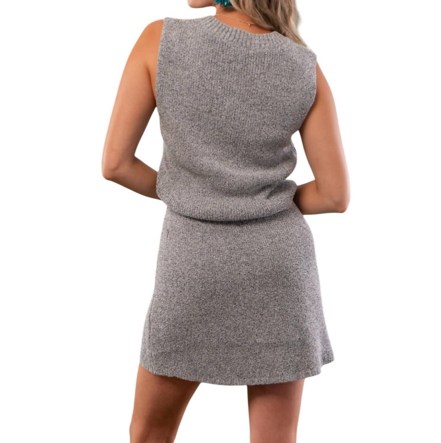 A match made in heaven. This two-piece set is so cute, you'll wish you could wear it out of the house! Did we mention how comfortable it is, too? You may want two sets! Introducing the V-neck Sweater Tank Set by TCEC, a chic grey ensemble perfect for elevating your style. This sleeveless set is crafted from a soft knit material featuring a flattering V-neckline and a cropped fit. The mini skirt offers added comfort with its elastic waistband, making it versatile for multiple occasions. Care for this stylish loungewear set by hand washing and laying it flat to dry.