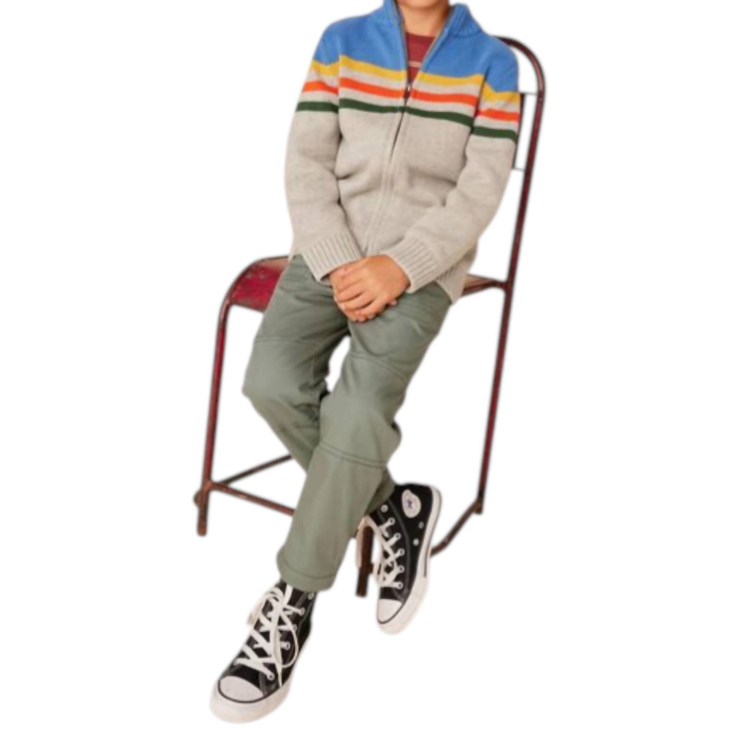 Introducing the Striped Traveler Zip Sweater by Tea Collection, a delightful addition to any young boy's wardrobe. This cardigan features a zip closure and charming funnel neck, perfect for layering over tees and flannels. Made from ultra-soft 100% combed cotton, this medium heather grey sweater pairs vibrant stripes with heirloom-quality craftsmanship. Care for it with ease by machine washing and laying flat to dry.