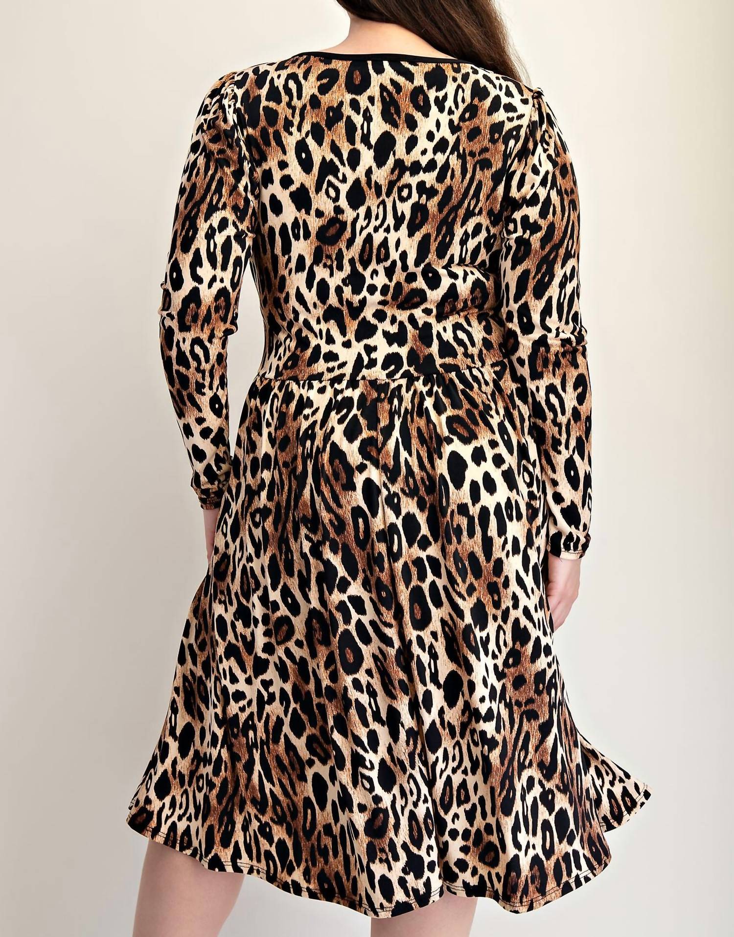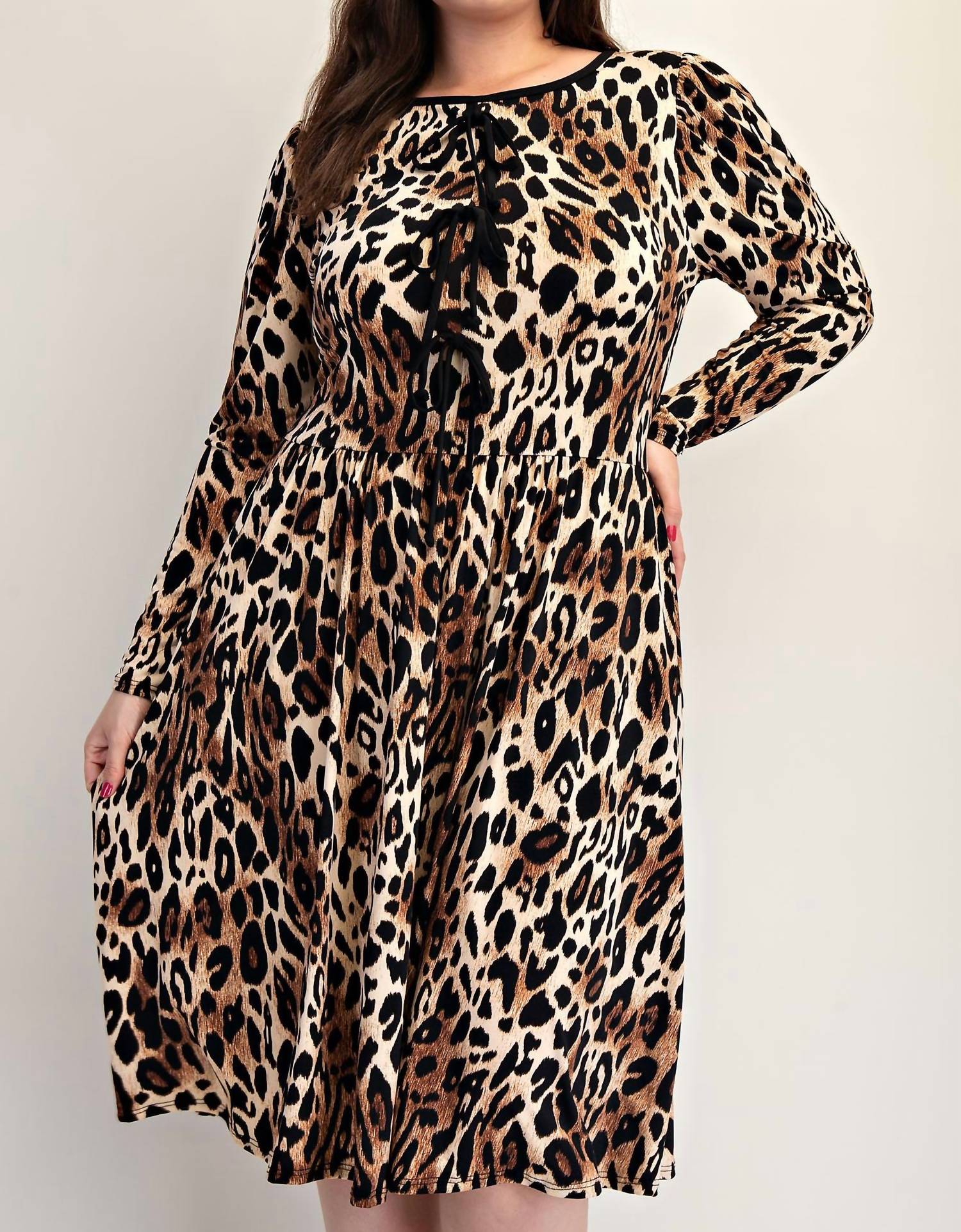 A midi dress so versatile, your options for wearing it are endless. Introducing the Plus Size Animal Print Flare Dress With Bow Details by The Curve LA, a distinctive addition to your wardrobe in striking black and camel. This knee-length dress features long puff sleeves, crafted with an eye-catching all-over leopard print and complemented by a contrasting round neckline. Enjoy the added practicality with side pockets and a charming touch of three bows at the front, all structured within a fit and flare silhouette. Made in the US, it's designed for easy care with machine wash instructions.