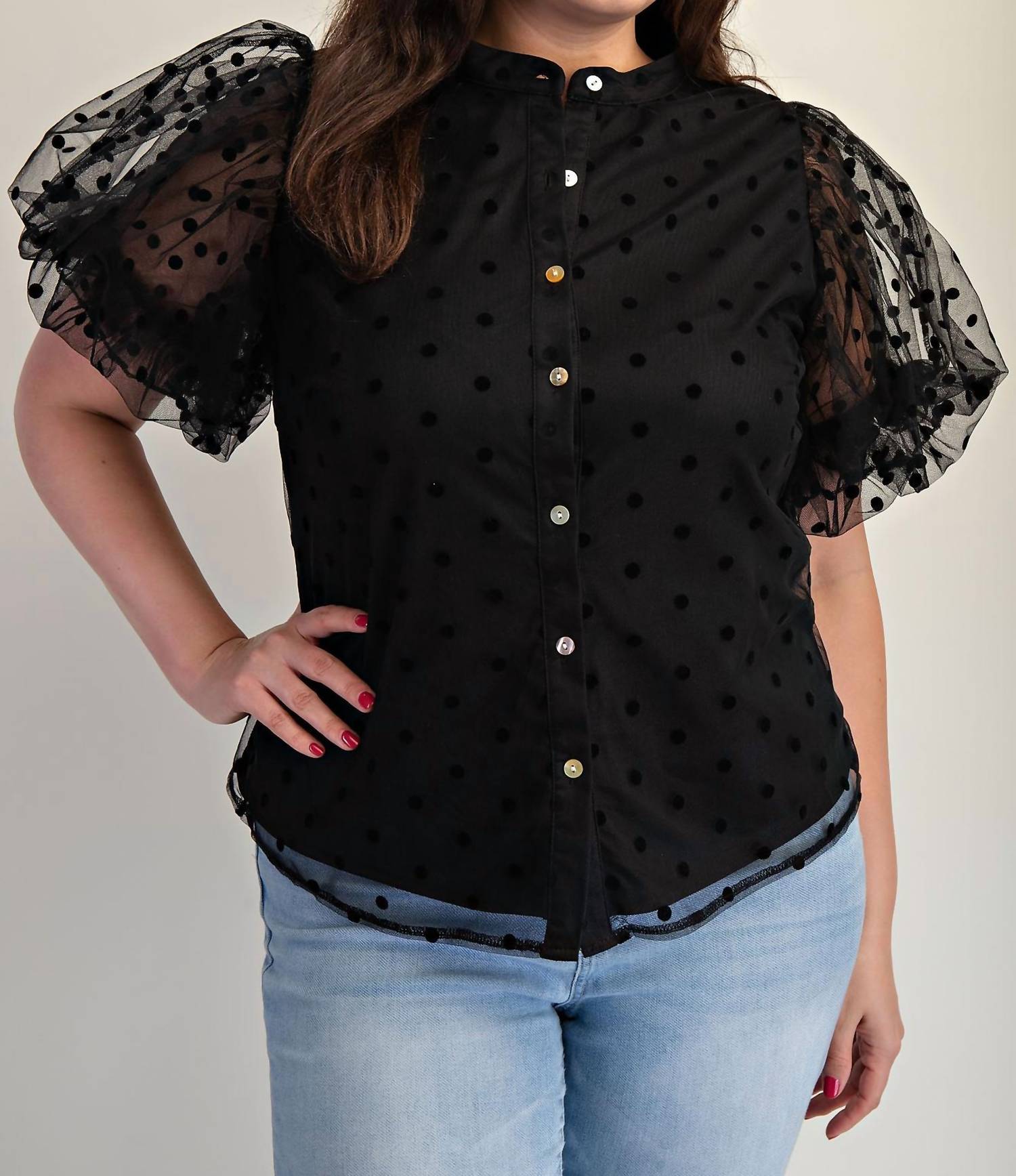 Pair this with your favorite jeans and slides for your next girls night out. Meet the Plus Size Dot Mesh Knit Shirt by The Curve LA, an elegant choice for your workwear wardrobe. This blouse flaunts sheer short puff sleeves and a banded collar, seamlessly blending style with sophistication. Made of premium materials in the United States, it offers a button-front closure for ease of wear. Care: Hand wash recommended. Perfect for spring, this shirt features a lined front for added comfort and confidence.