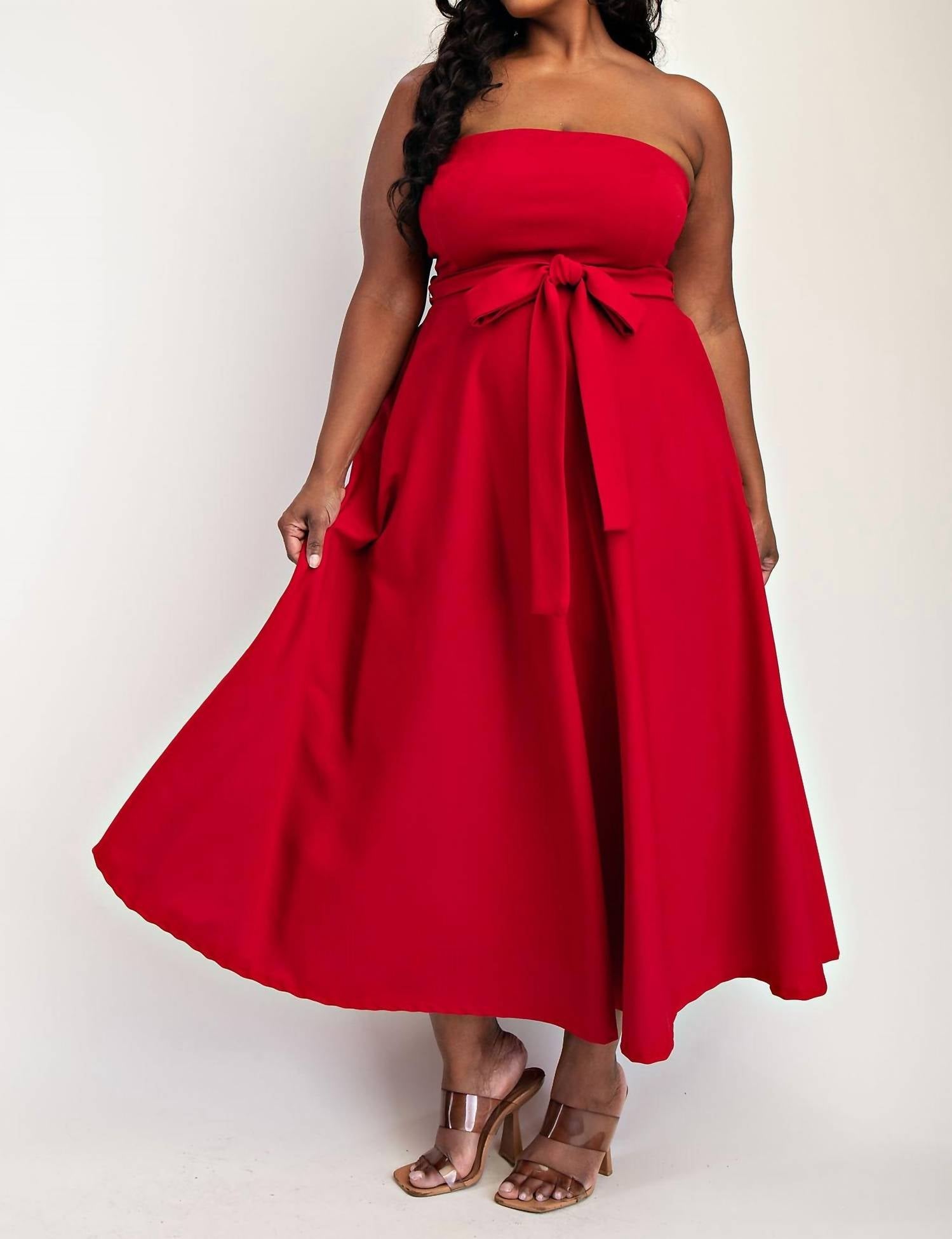 A strapless dress so versatile you can dress it up with heels or wedges, or give off a more casual vibe with flats. Discover the Plus Size Knit Tube Maxi Dress with Self Belt by The Curve LA, a stunning addition to your wardrobe in vibrant red. This strapless A-line dress features a flattering squareneck with a self-tie sash, accentuated by practical front pockets. Made in the United States, this solid-patterned piece offers a chic pull-on closure for seamless wear. Easy to care for, simply machine wash to maintain its fresh look, perfect for springtime dinner parties or special occasions.