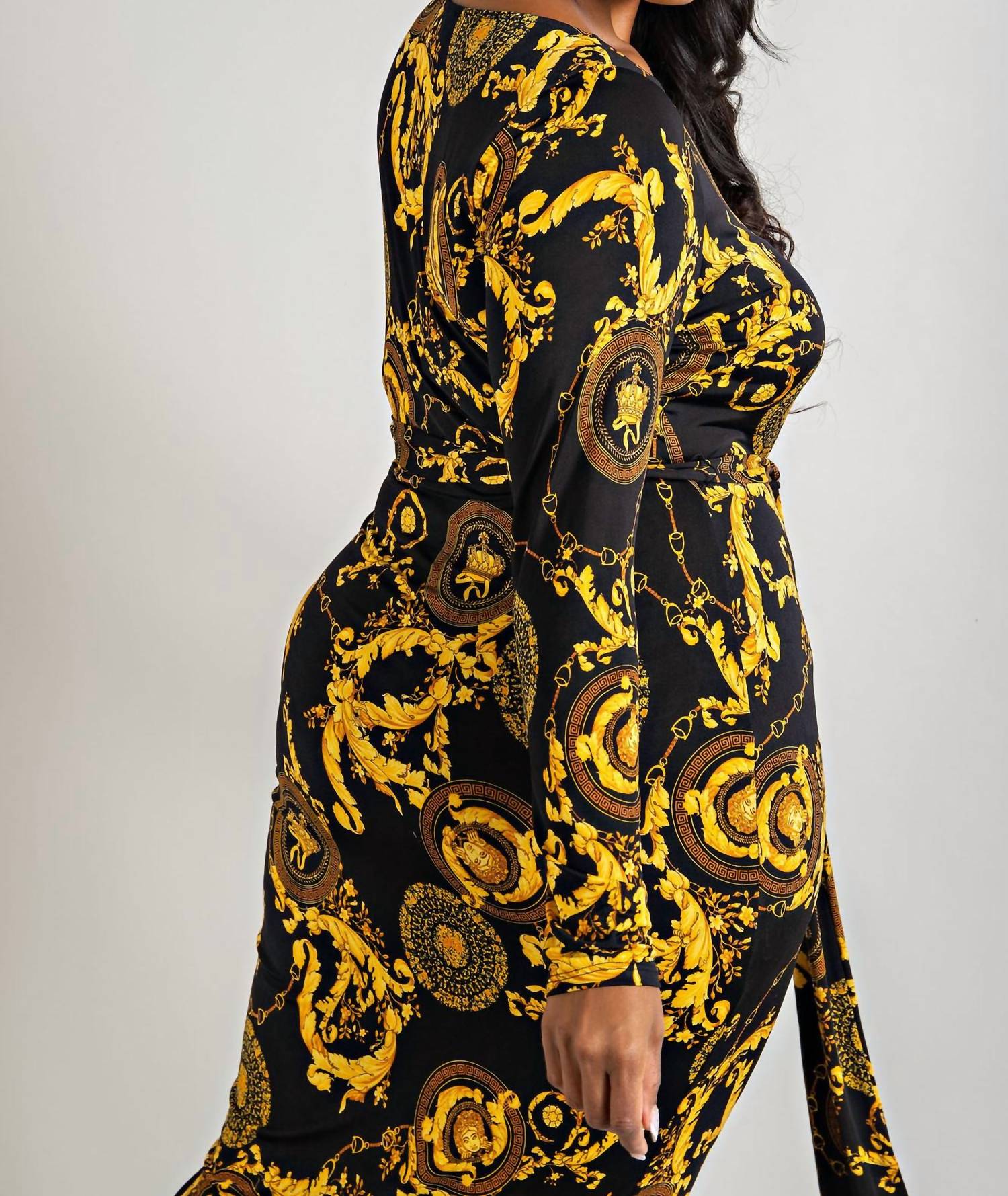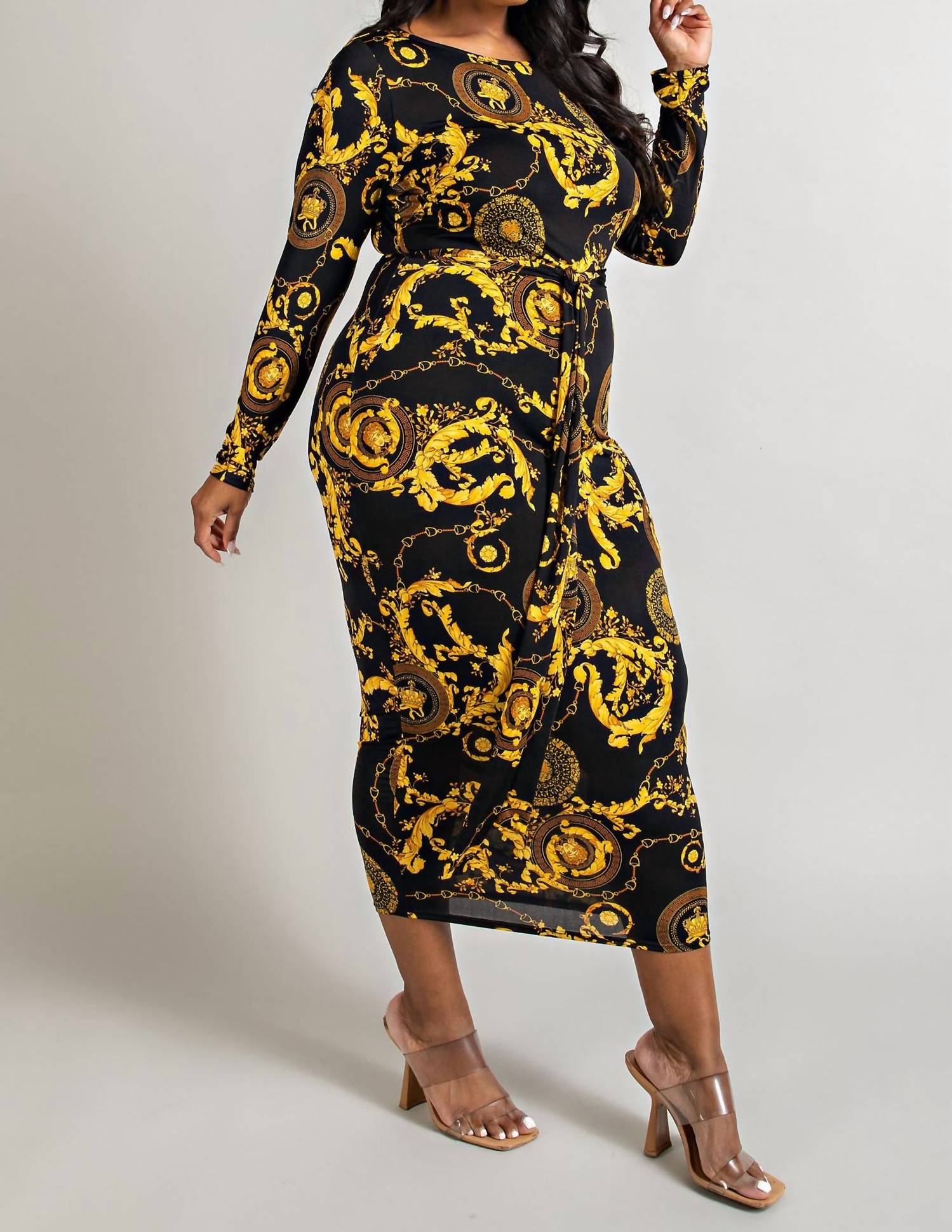 Step into elegance with The Curve LA's Plus Size Bodycon Midi Dress, perfect for any evening event or Thanksgiving celebration. With its long sleeves and round neck, this patterned dress stands out in sophisticated black and yellow. Crafted in the United States, it features a convenient pull-on closure and a chic tie belt, accentuating your silhouette. For optimal care, simply machine wash as needed.