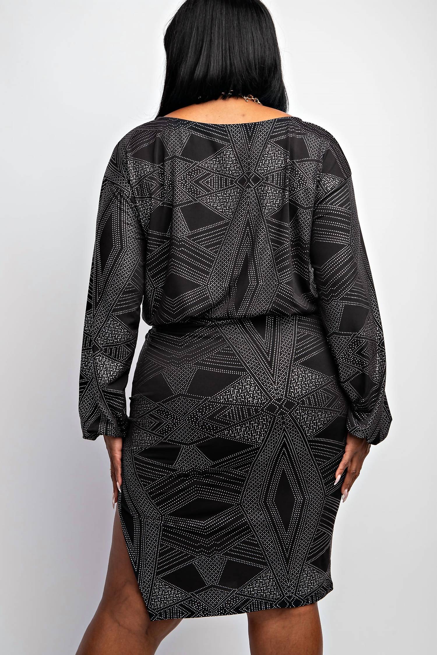Introducing the Plus Size Metallic Long Sleeve Top and Knee Skirt Set by The Curve LA, an elegant choice for your next dinner party or New Year's Eve celebration. This stylish set features a long sleeve top and a matching knee-length skirt, both adorned with a sophisticated metallic foil print in silver and black. Designed with a comfortable elasticized waist and a side leg slit for added flair, it ensures both style and ease. Made in the United States, this pull-on ensemble is suitable for machine washing, reflecting the trend of quiet luxury for the fall season.