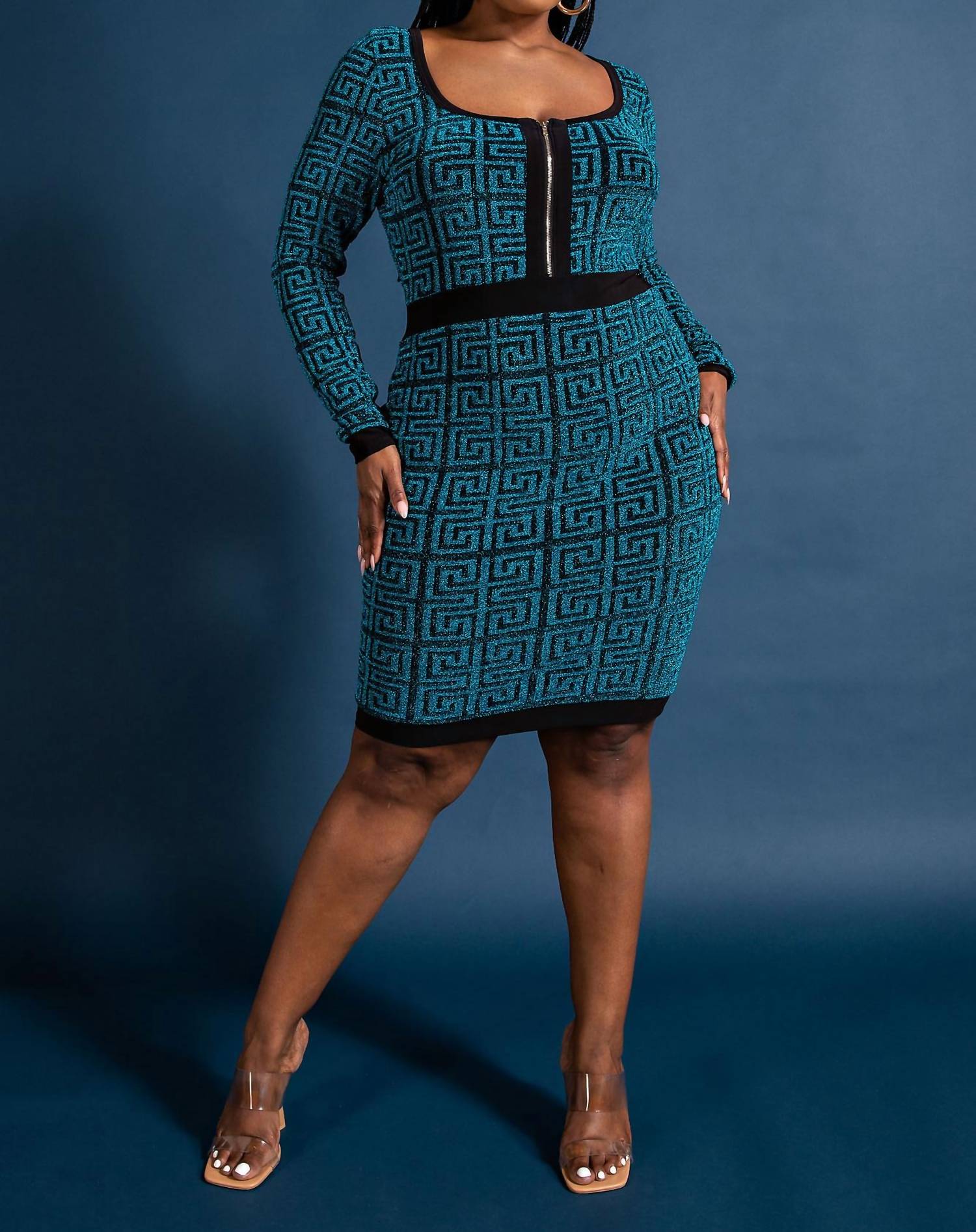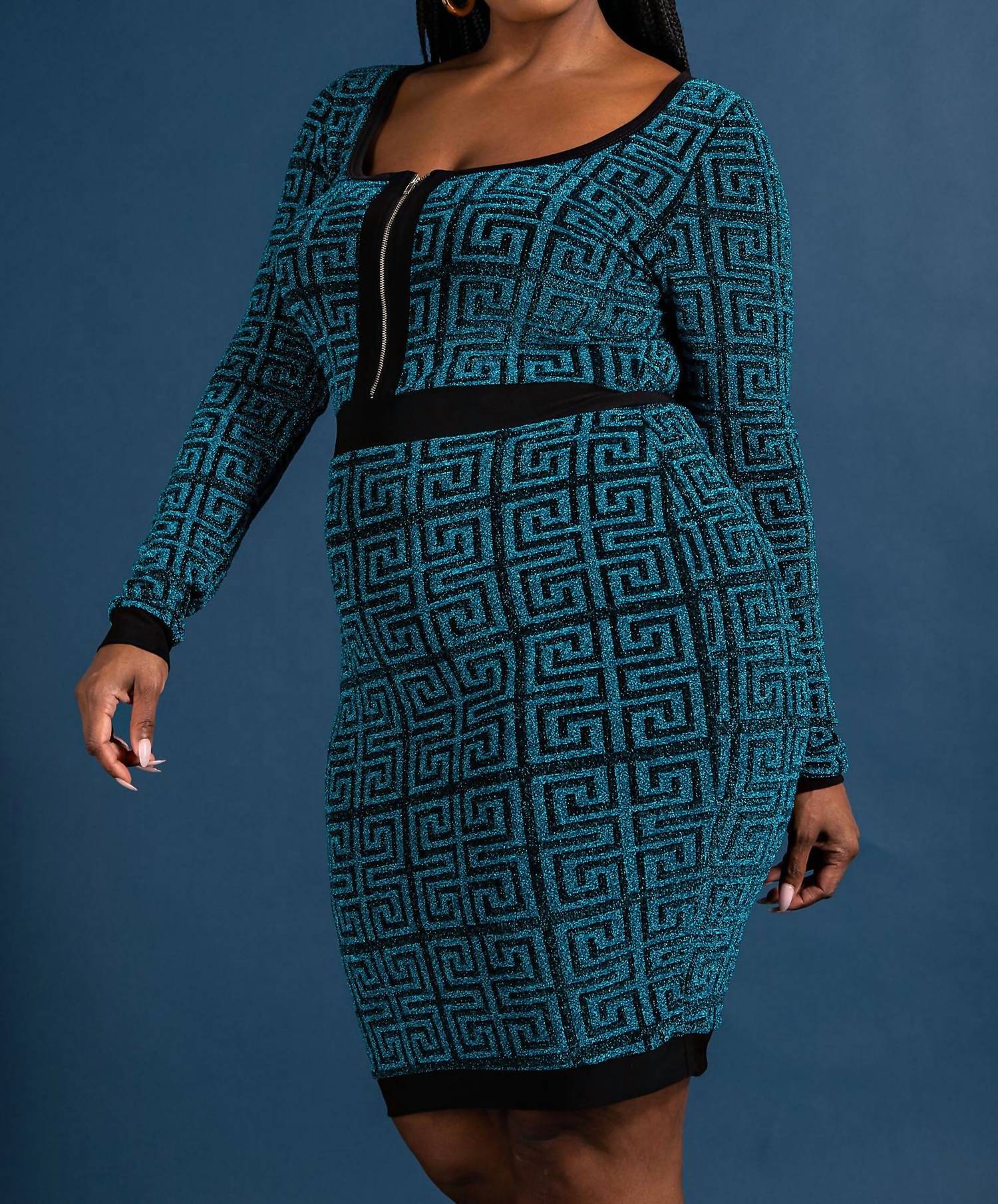 The kind of easy and flattering dress you'll be reaching for all season long. Elevate your evening attire with The Curve LA's Plus Size Monogram-pattern Zip-up Dress, an eye-catching choice for any dinner party. This turquoise and black knee-length dress is crafted in the United States from midweight lurex and spandex, featuring long sleeves and a bodycon silhouette. The dress boasts a front exposed zip closure with a scoop neckline, ensuring both style and comfort. Perfect for spring occasions, this standout piece is designed to make a statement.