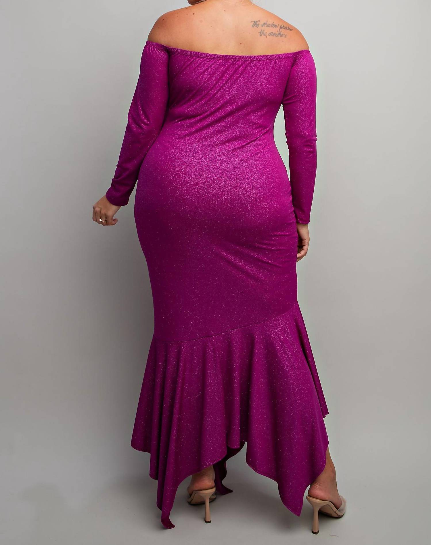 A maxi dress that is just as cute as it is comfortable. Introducing The Curve LA Plus Size Off Shoulder Metallic Knit Dress, a standout piece in a vibrant magenta hue perfect for holiday celebrations. This maxi dress showcases a glamorous allover glitter pattern, long sleeves, and an off-the-shoulder neckline that enhances its elegant appeal. Designed with an asymmetric hem featuring a side slit and a bodycon silhouette, this dress effortlessly combines sophistication and allure. Made in the United States, it offers a pull-on closure and is machine washable for easy care.