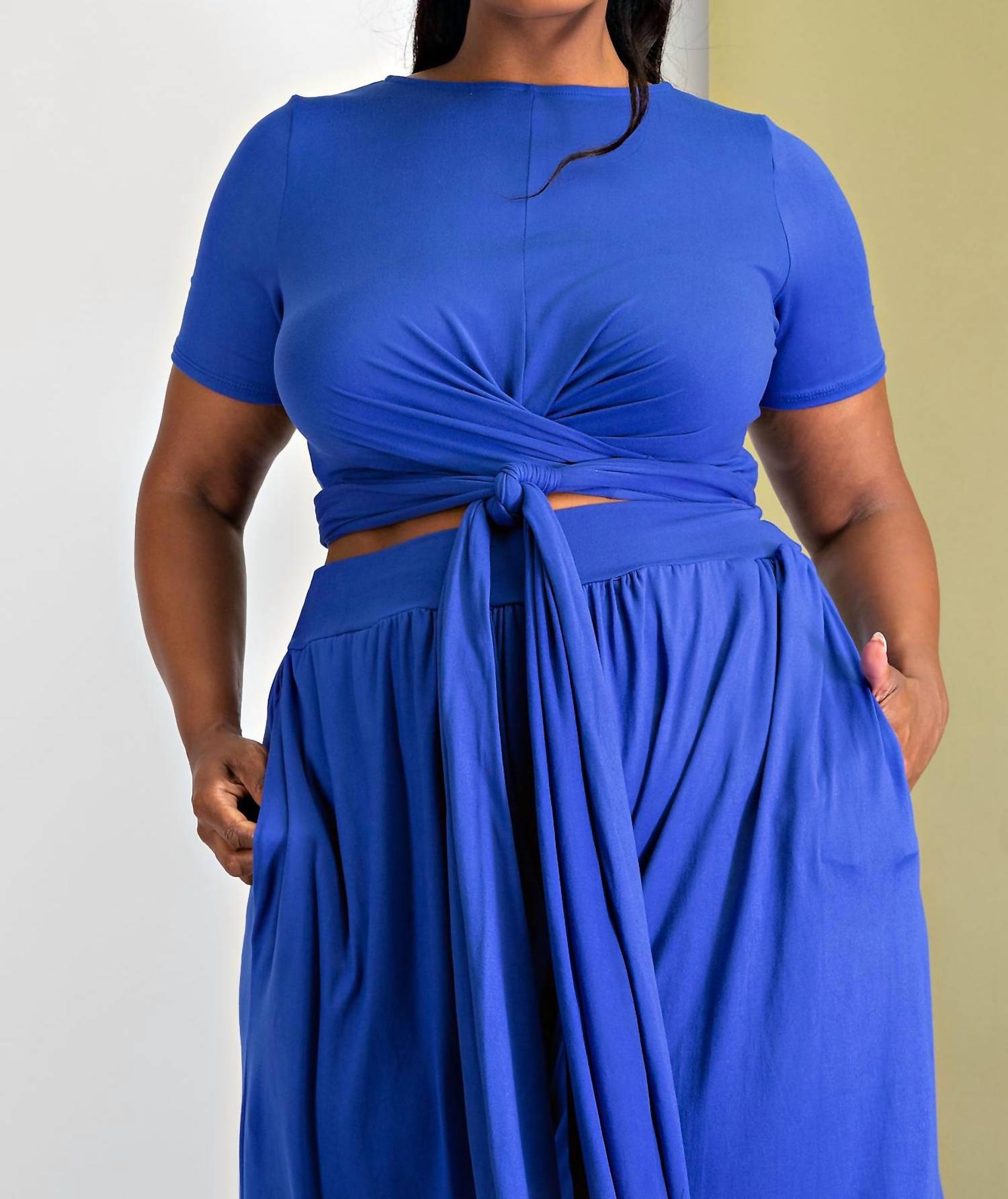 Introducing the Plus Size Wrap Around Short Sleeve Top and Palazzo Pants Set by The Curve LA, a stylish and comfortable loungewear essential in vibrant royal blue. The top features short sleeves and a wrap-around design, while the pants offer a wide-leg fit with convenient side pockets for added practicality. Made in the United States, this set is a perfect travel companion for spring occasions and features a pull-on closure for easy wear. Care for this set by machine washing as needed.