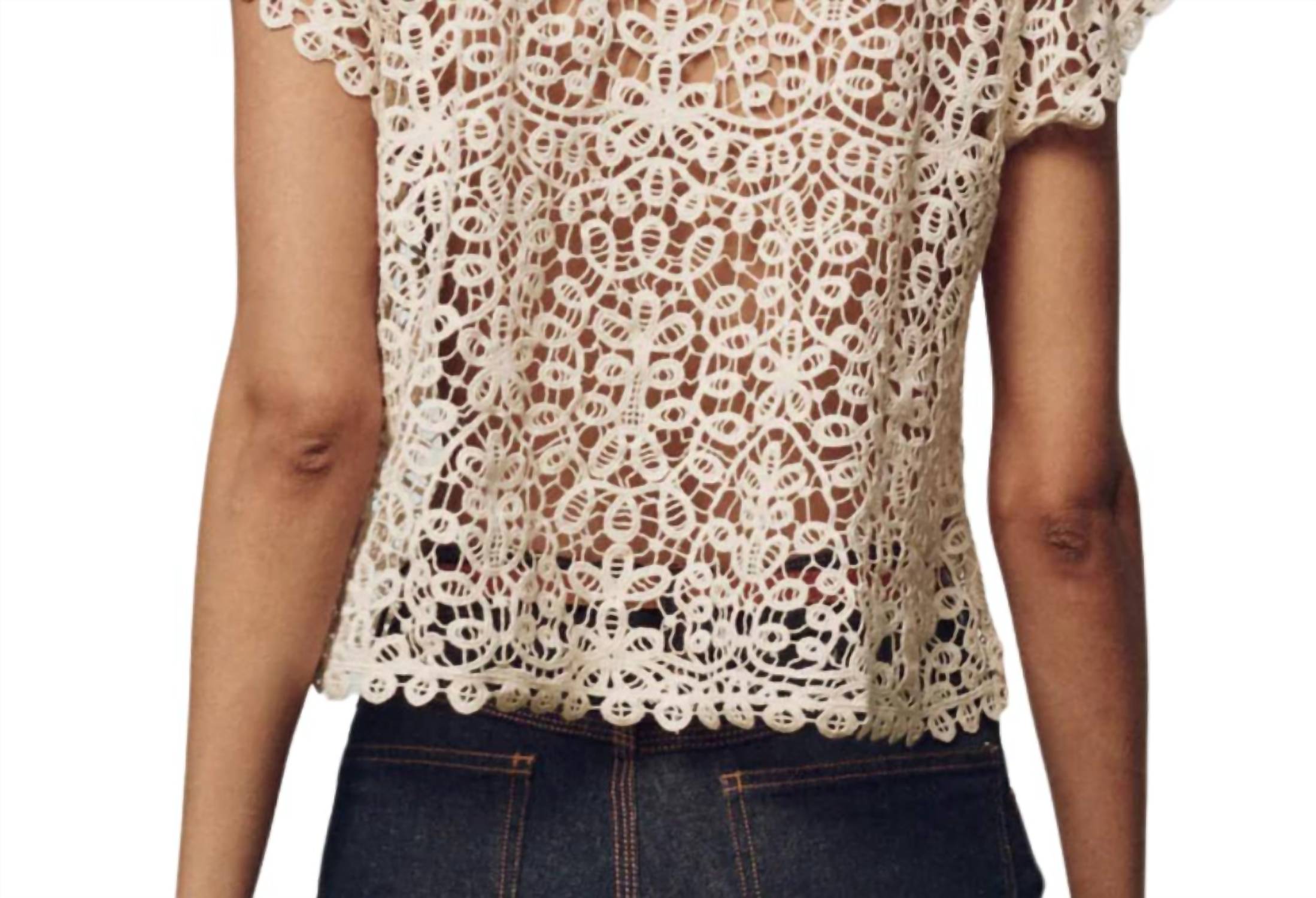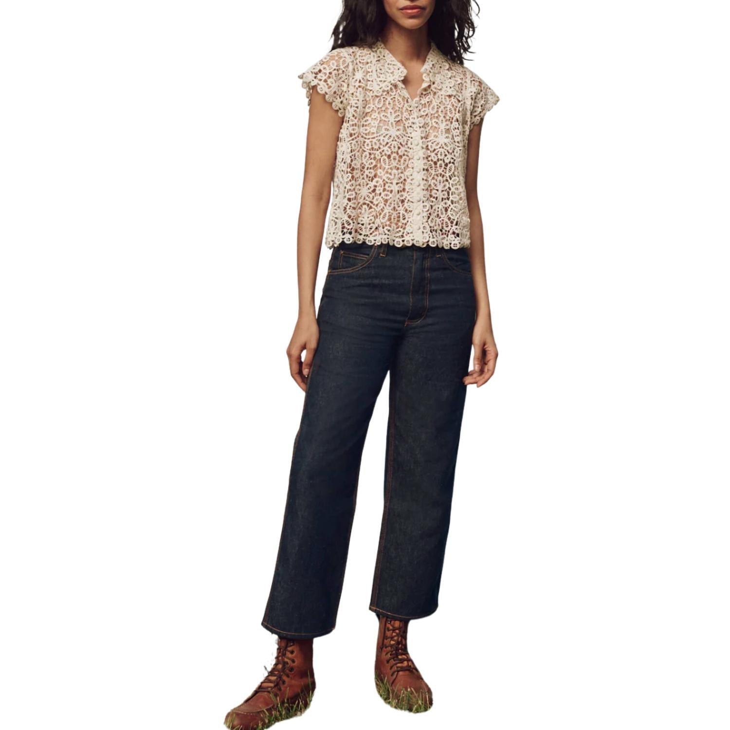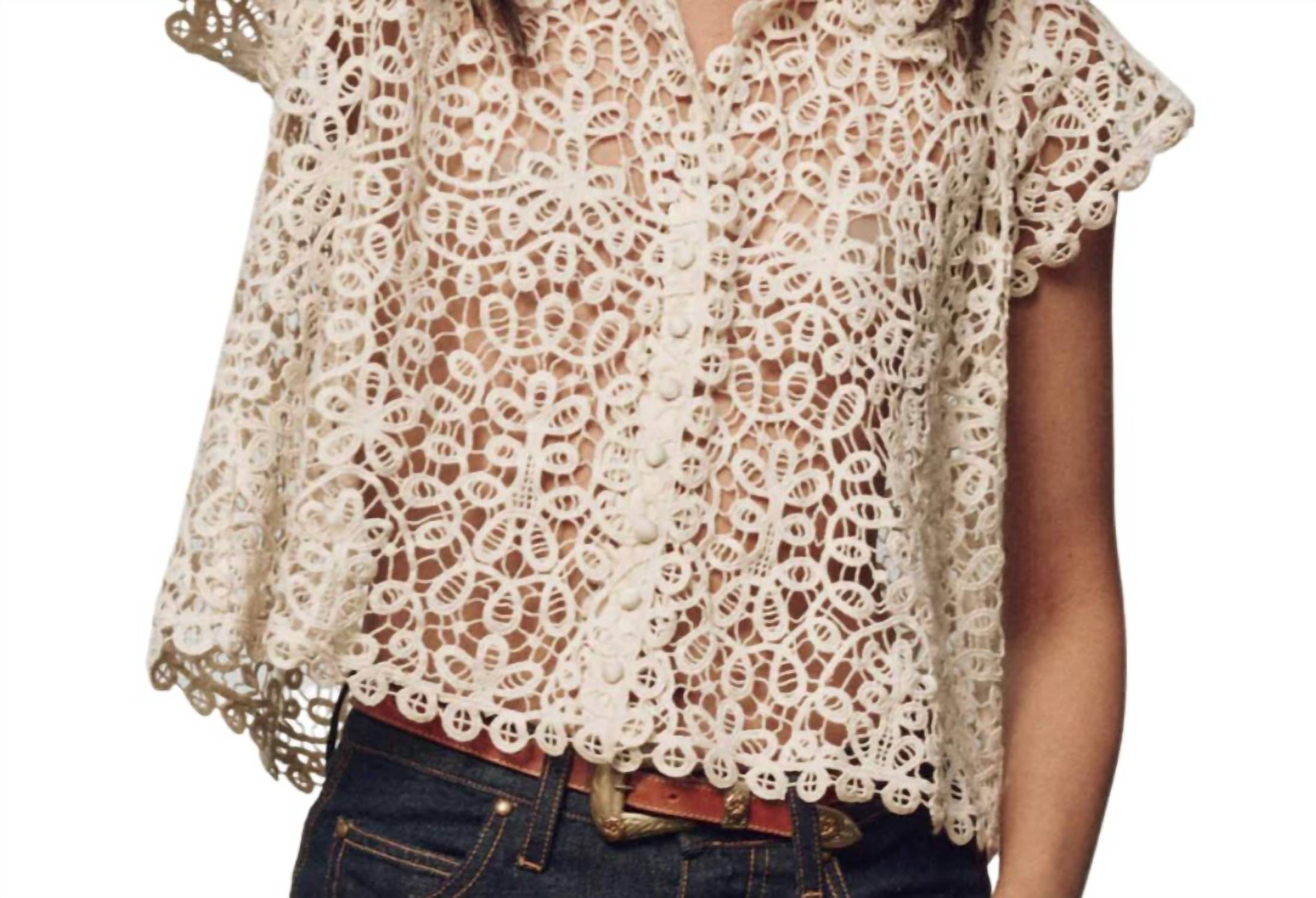 A versatile blouse that works from desk to dinner! THE GREAT. The Lattice Top Cotton in Cream Intricate Heavy Lace Blouse Openwork Pattern Scalloped Lace Edges Peaked Cap Sleeve Collared Boxy Fit Viscose Lining Self-Covered Buttons Size 1 Length 21"
