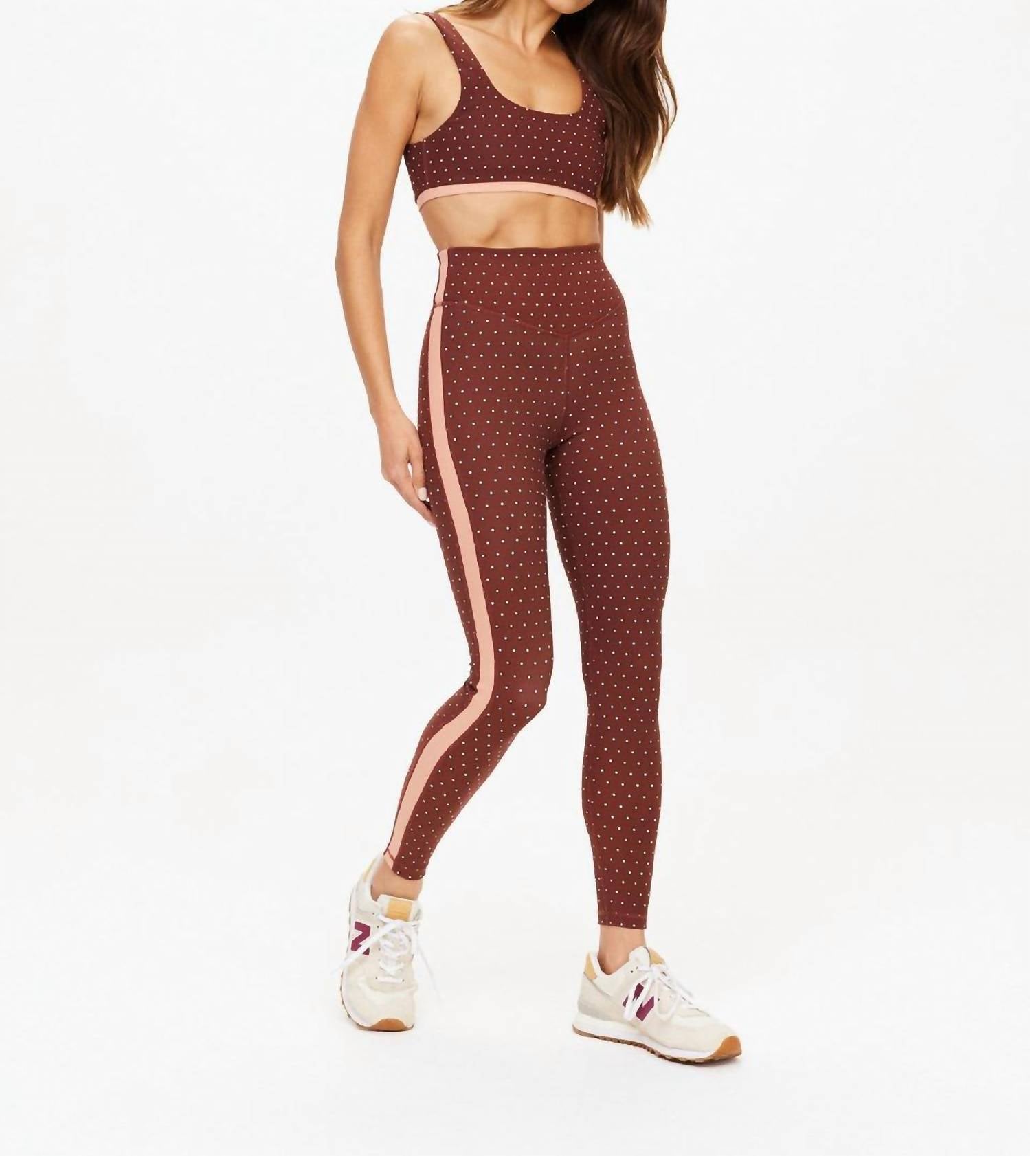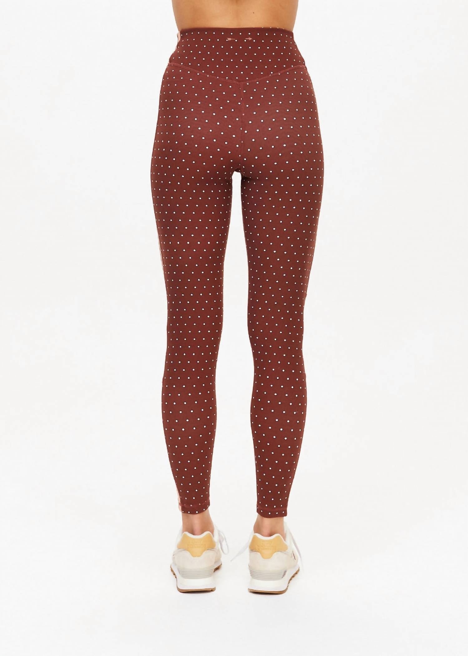 You'll be reaching for this best-selling legging all season long. Introducing the Maho Midi Leggings by THE UPSIDE, designed to bring style and comfort to your activewear collection. These women's high-rise leggings feature a V waistband and a skinny leg, crafted from soft recycled polyamide with a playful polka dot pattern. The contrast splice panel and signature arrow logo embroidery add a unique touch, while the pull-on design ensures easy wear. Care instructions include machine wash and line dry.