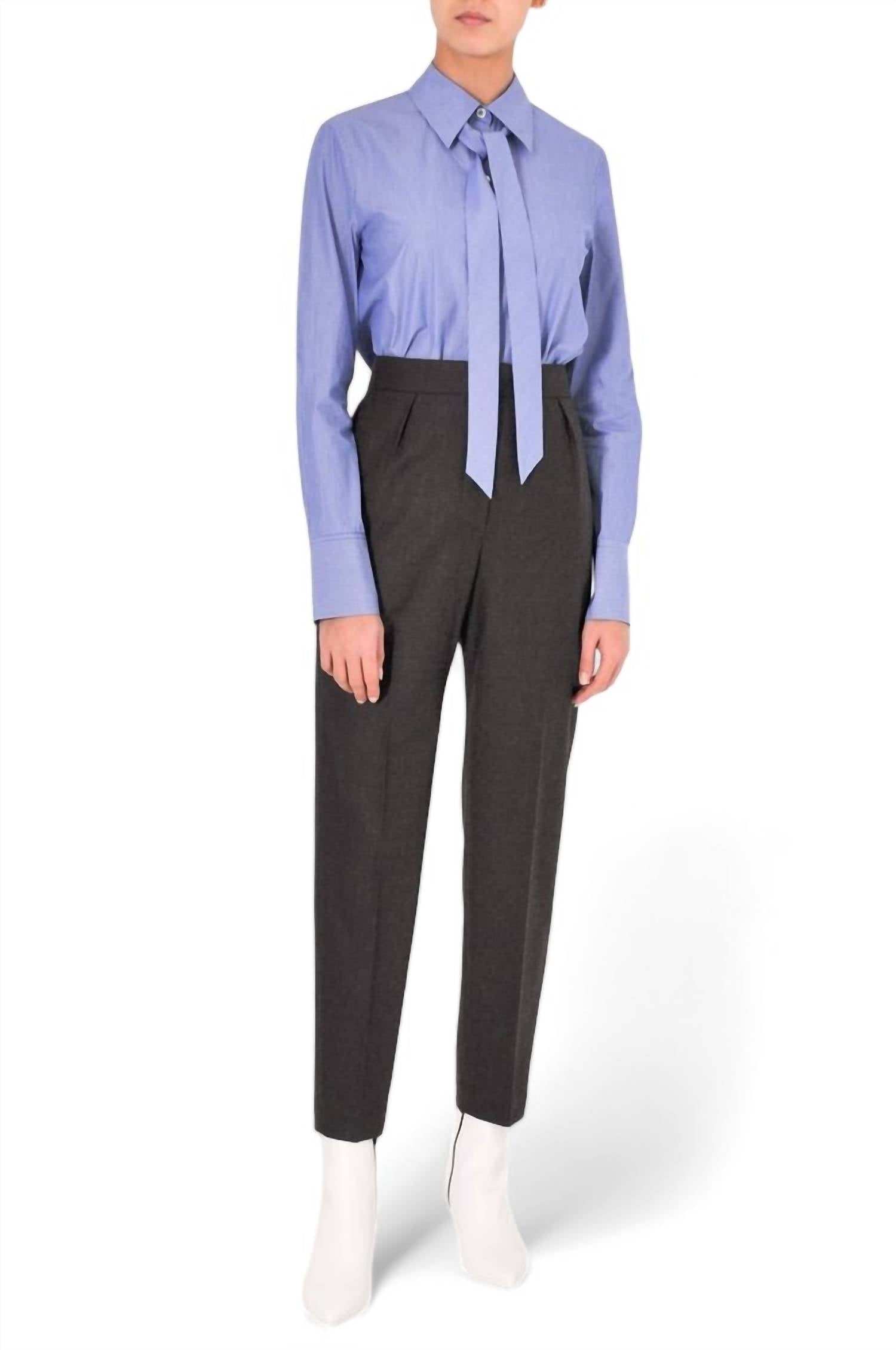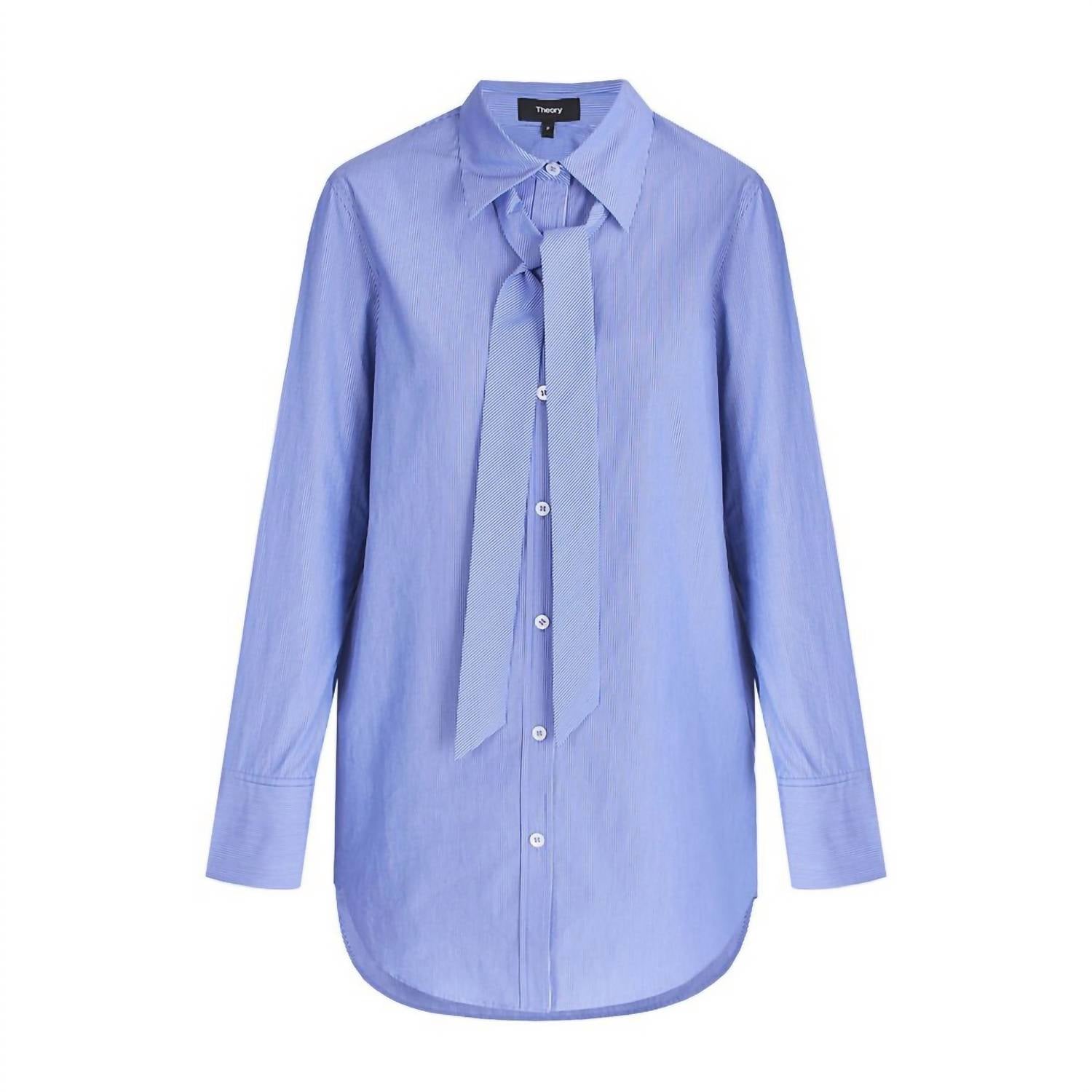 This shirt features a collar and tuxedo tie, along with a button-down front and long sleeves. It has a curved hem and is made from 100% cotton. Machine wash cold. Runs small.