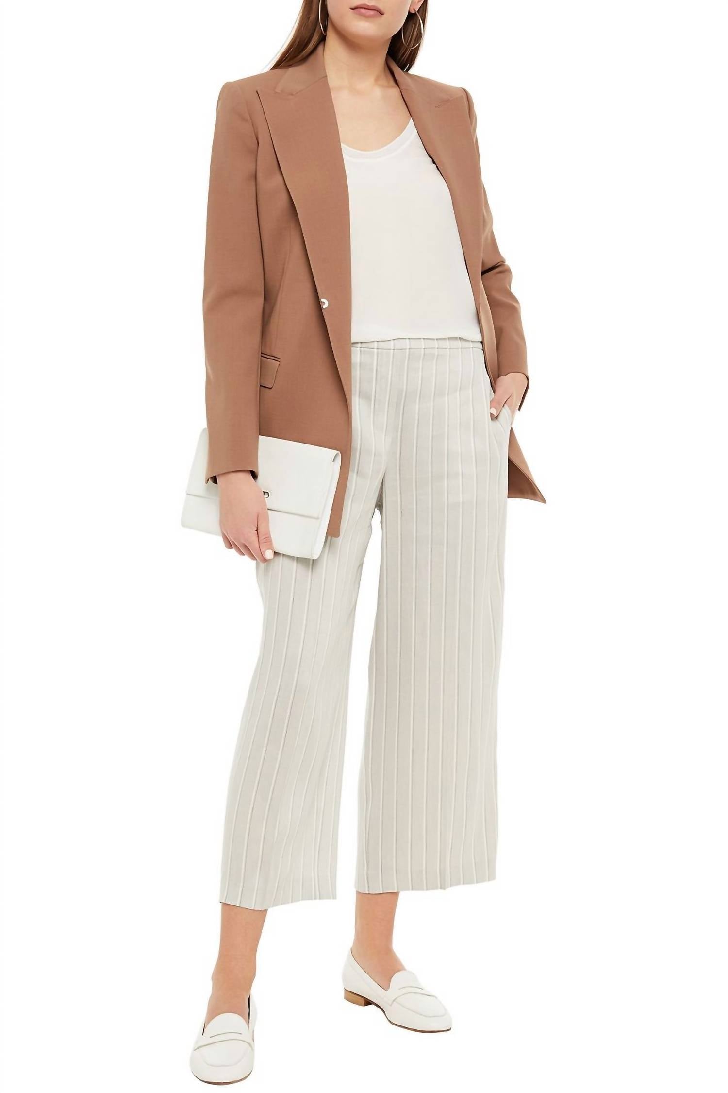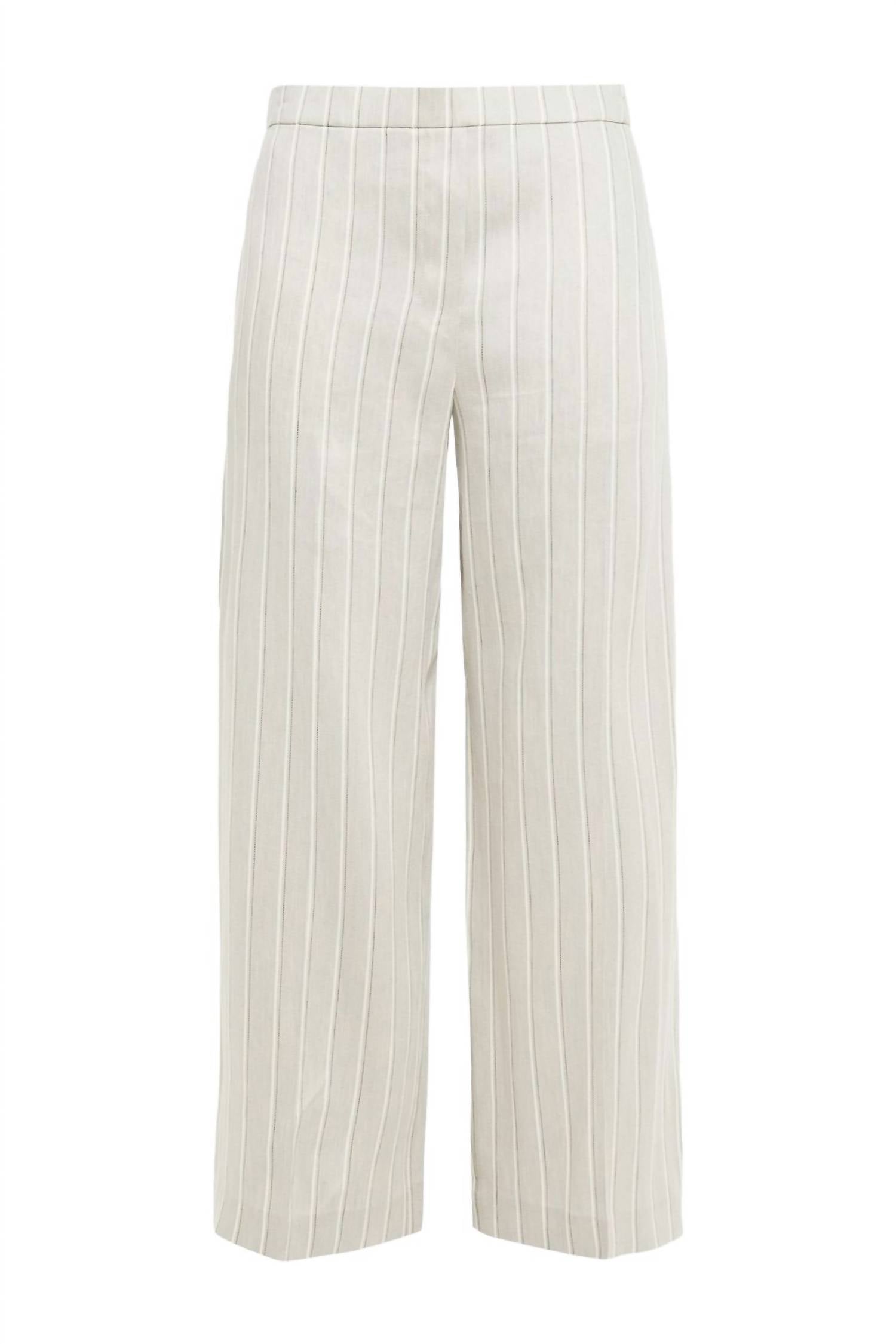 These cropped pants feature a high-rise cut with a partially elasticated waistband for added comfort. Designed with two side slit pockets and a back welt pocket, they offer a pull-on style for ease of wear. The stretchy, mid-weight fabric is composed of 66% linen, 32% viscose, and 2% elastane, making them both comfortable and durable. Dry clean only. True to size with a 12" rise and a 25" inseam, based on a size 0.