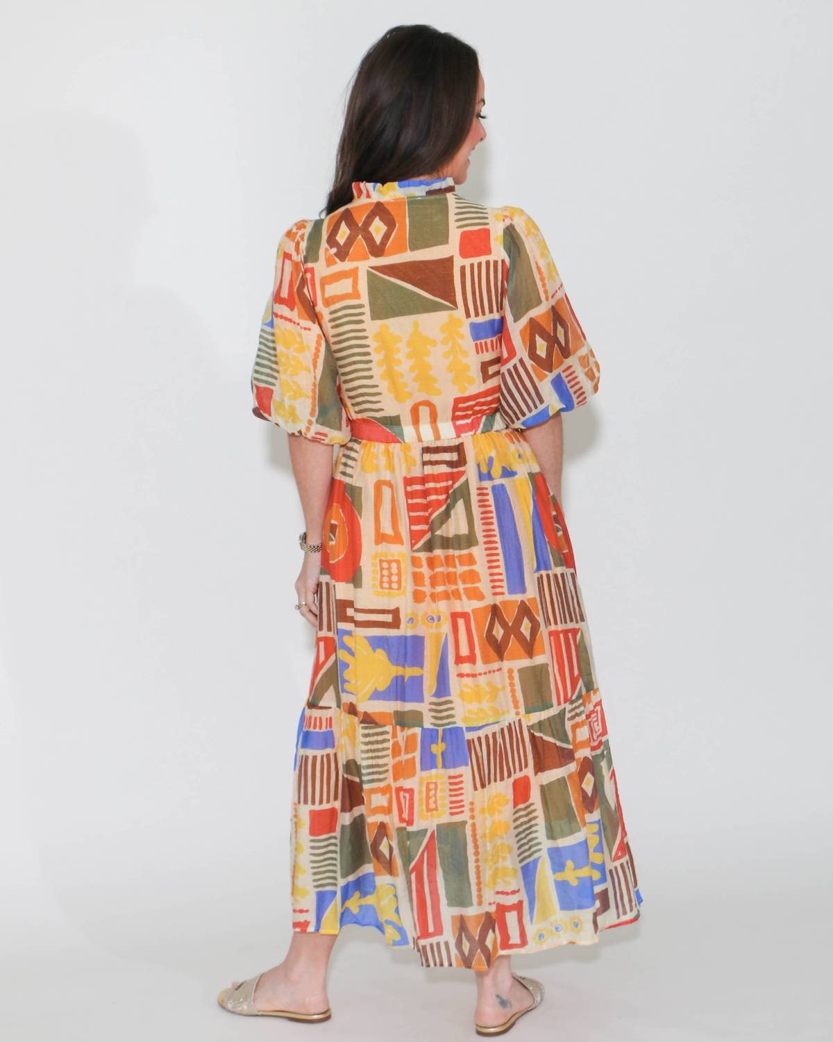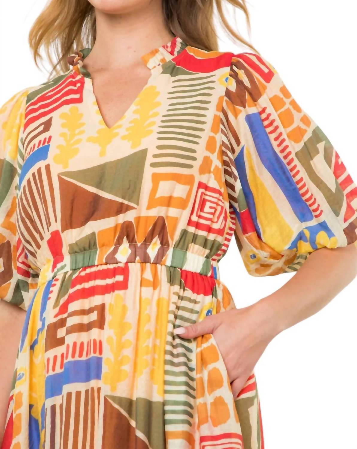 A midi dress so versatile, your options for wearing it are endless. Introducing the THML Abstract Print Dress, a chic addition in beige multi for your summer wardrobe. This A-line midi dress features a stylish abstract print, short sleeves, a V-neck, and convenient pockets for added functionality. Crafted from a 70% Rayon and 30% Nylon blend, it offers a comfortable, pull-on fit. Ideal for special occasions like Mother's Day or church gatherings, it embodies quiet luxury.